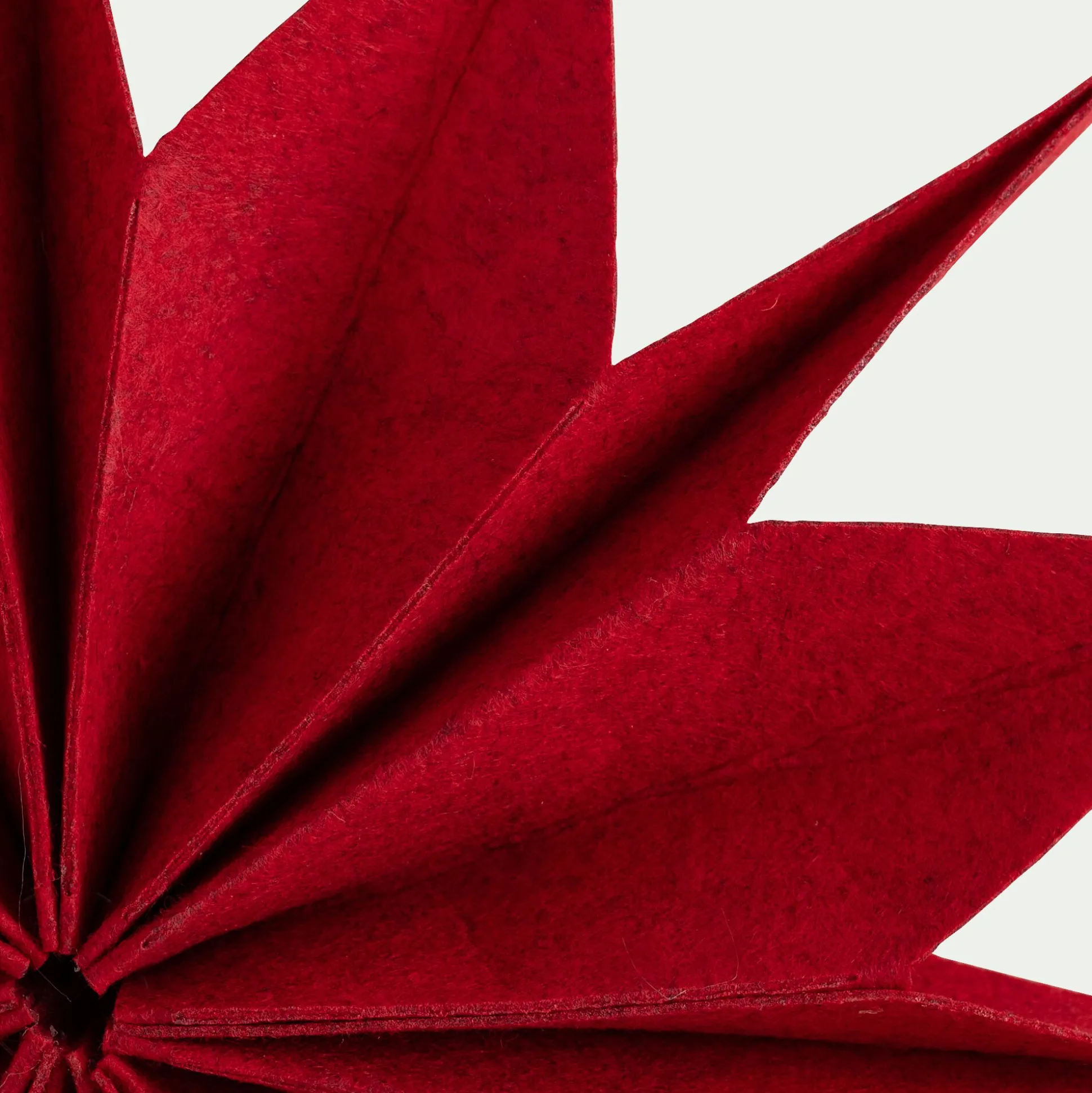 De 30cm de diamètre, cette étoile rouge en feutrine séduit par son allure poétique et graphique. Inspirée de l’origami, un art japonais, elle déploie avec élégance ses multiples branches, dans un coloris rouge qui rappelle la cape du Père Noël. À suspendre dans le sapin, dans un escalier ou sur une cheminée, elle insuffle une touche élégante à la décoration de Noël. Une pièce forte, à la fois simple et envoûtante, pour célébrer les fêtes avec douceur.