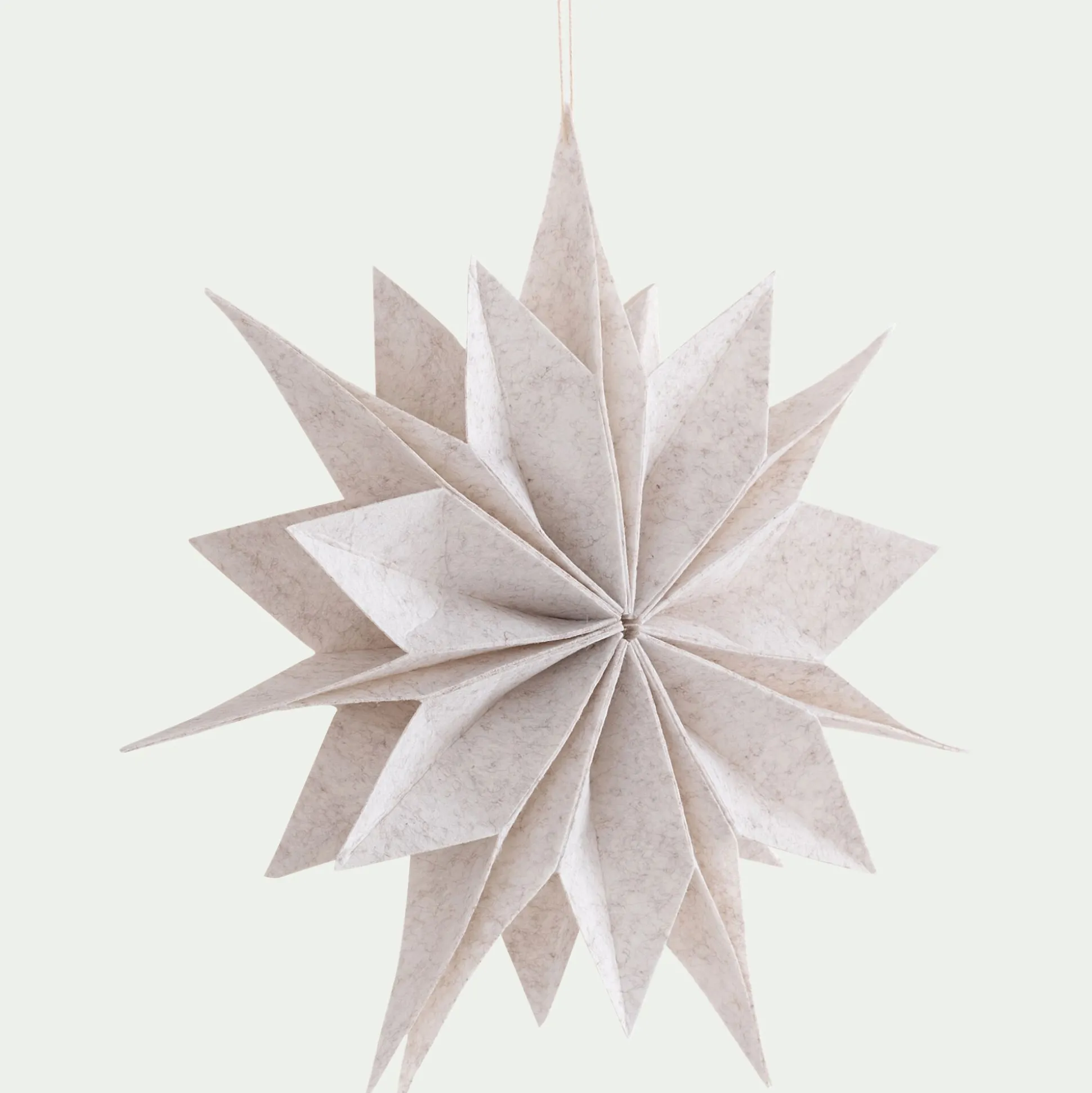 De 40cm de diamètre, cette étoile blanche en feutrine séduit par son allure délicate et graphique. Inspirée de l’art de l’origami, elle déploie avec élégance ses multiples branches, dans un coloris blanc qui rappelle la magie silencieuse de l’hiver. À suspendre dans le sapin, devant une fenêtre ou sur un mur, elle insuffle une touche aérienne et poétique à la décoration de Noël. Une pièce forte, à la fois simple et envoûtante, pour célébrer les fêtes avec douceur.