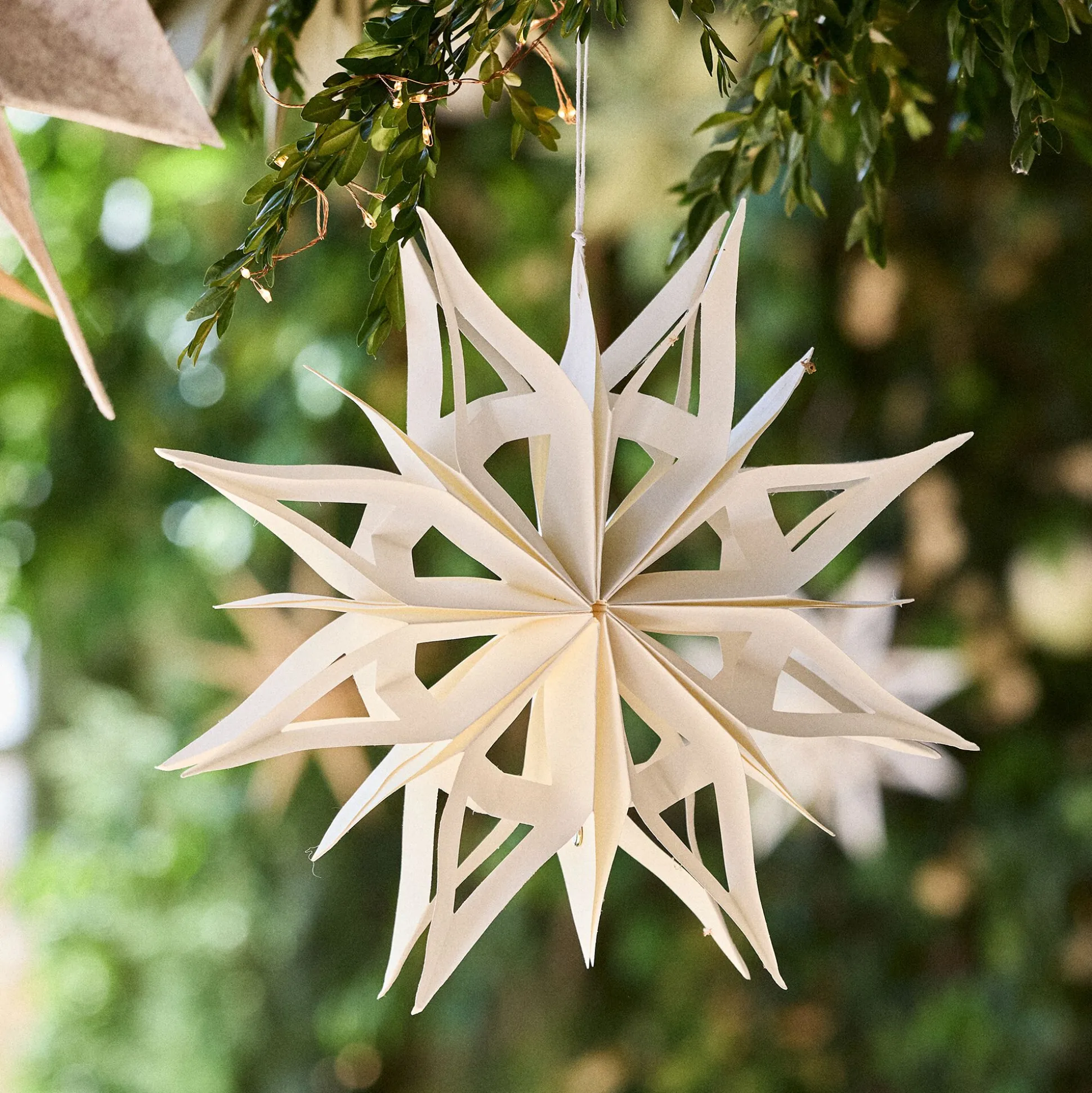 En papier ajouré, cette décoration à suspendre en forme d’étoile apportera une touche de poésie et d’élégance à votre intérieur. Sa matière légère et ses lignes délicates créeront un jeu de lumières et d’ombres qui sublimeront la pièce. Idéale pour les fêtes de fin d’année, elle peut être suspendue à une branche de sapin ou au plafond pour créer une atmosphère féerique. Son design sobre et raffiné en fait un élément de décoration intemporel, qui s’accordera parfaitement à un style minimaliste, bohème ou plus classique.
