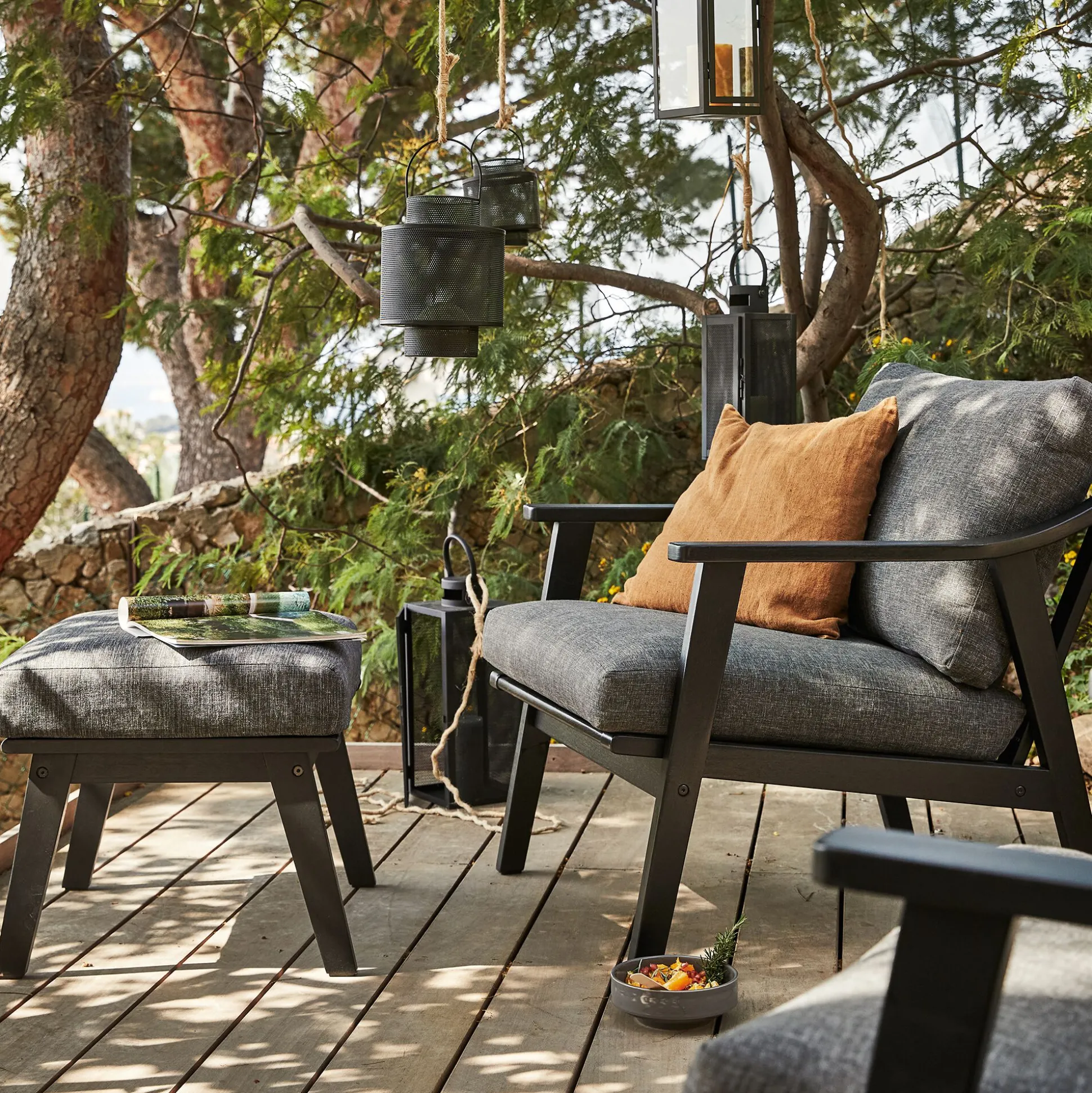 Optez pour cet ensemble composé d’un fauteuil et d’un repose-pieds en bois d’eucalyptus certifié FSC ®. Le design moderne de ces meubles associe une structure noire élégante à un coussinage texturé gris, apportant une touche raffinée à votre espace extérieur. Grâce à leur parfaite harmonie, installez-vous confortablement et profitez d’un moment de détente absolu. Parfait pour aménager un salon de jardin cosy et chaleureux, cet ensemble de mobilier de jardin s’intègre aussi bien en extérieur qu’en intérieur.
