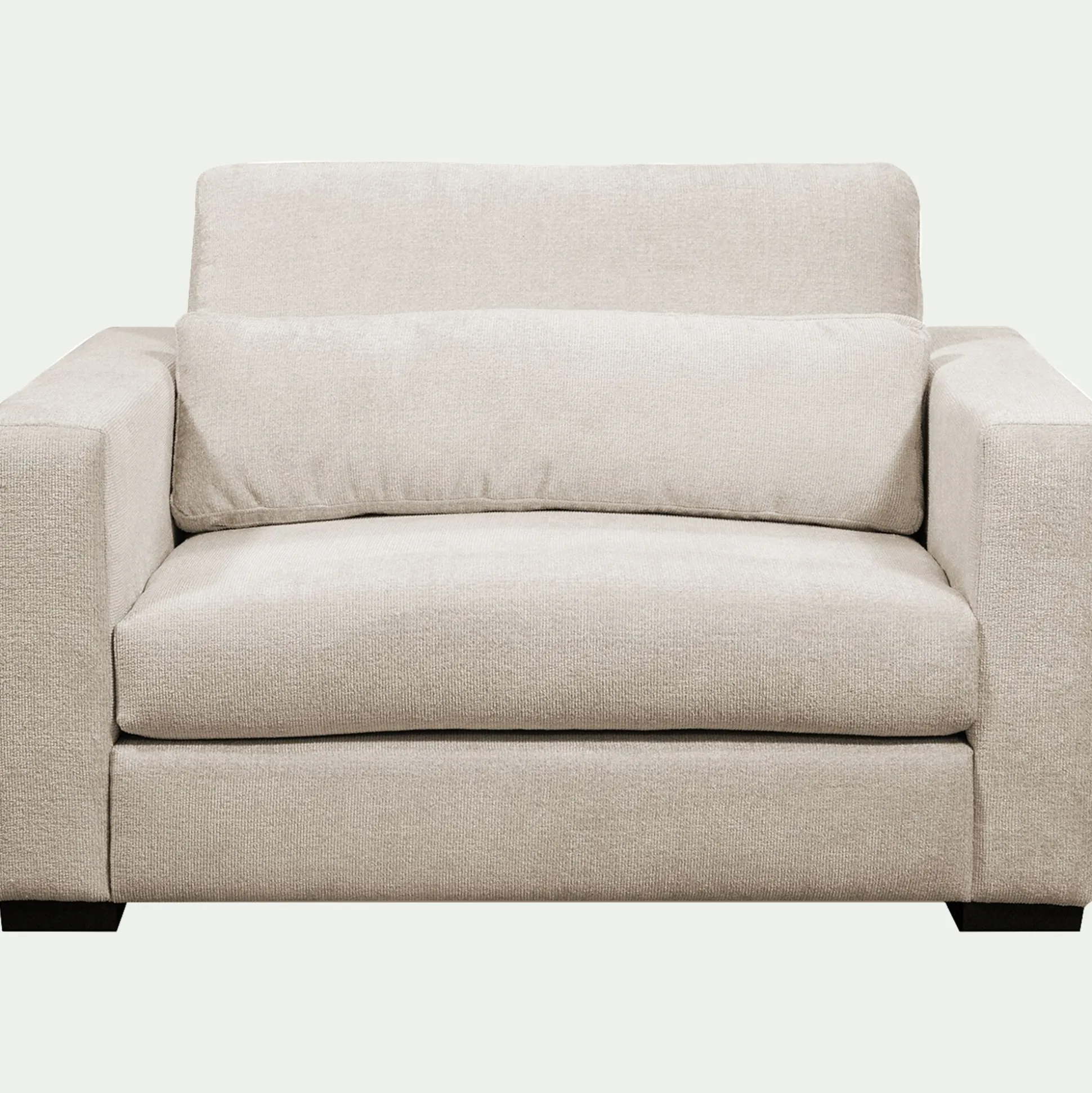 Avec son tissu beige et son design de caractère, ce fauteuil 1,5 places insuffle une atmosphère réconfortante et sophistiquée au salon. Son assise généreuse promet un confort parfait, renforcé par des coussins et de larges accoudoirs. Conçu en Ukraine, il bénéficie d’une structure et de pieds en bois massif, alliant solidité et durabilité. La texture douce du tissu lui confère un toucher agréable et un style intemporel. Véritable nid douillet, ce fauteuil en tissu invite à la relaxation. Son coloris beige participe à un décor lumineux et accueillant, facilement associable à des coussins colorés ou à motifs.