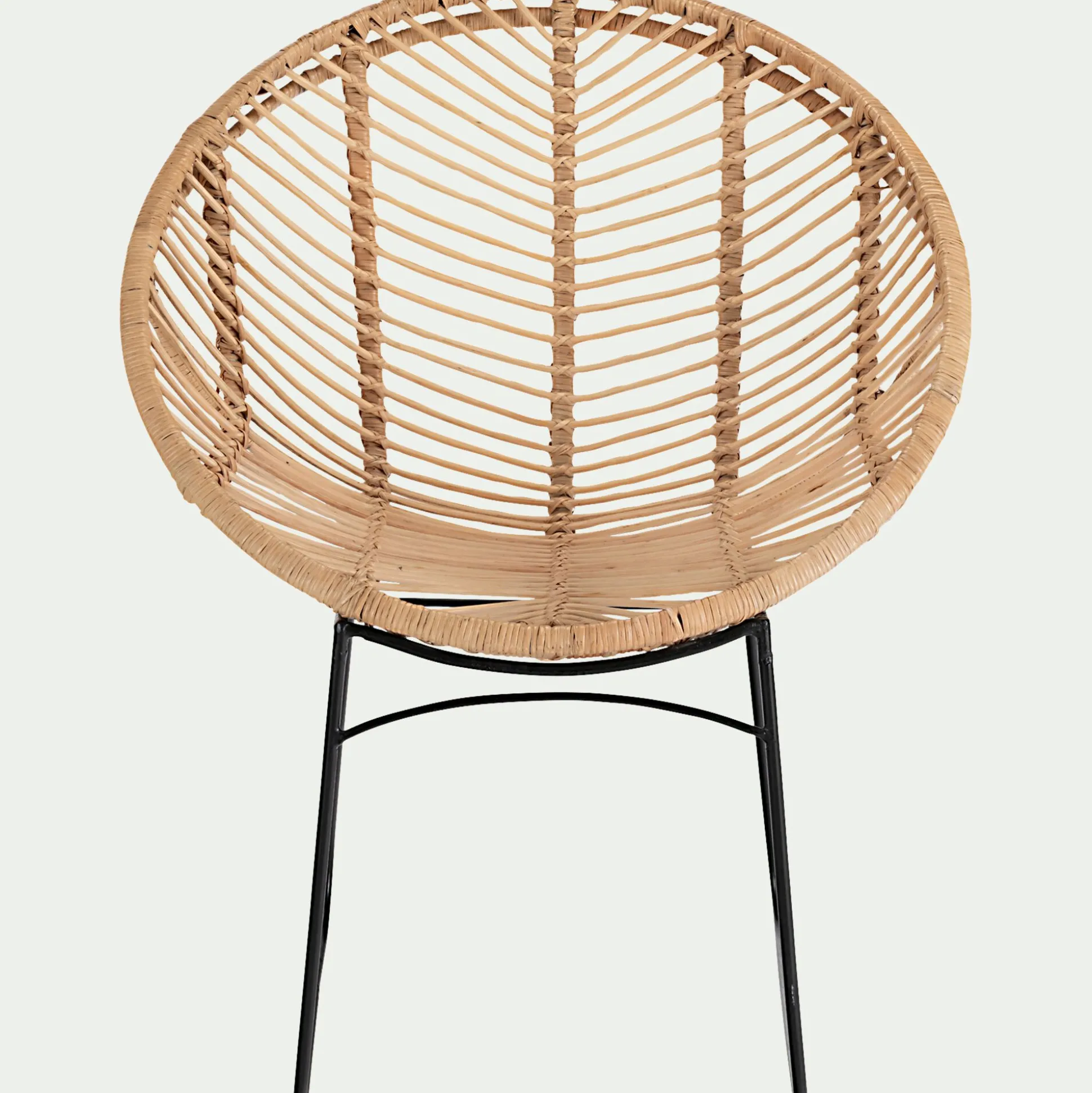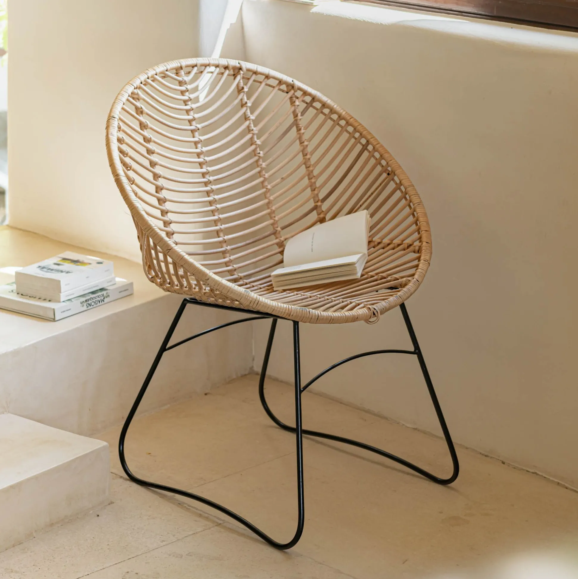 Ce fauteuil en rotin arbore une forme ronde, emplie de douceur. Le rotin enveloppe la structure en métal. Ce travail minutieux offre une assise en forme de coupole, une belle forme organique qui fait naître une atmosphère cocooning. Cette assise naturelle repose sur un piétement en métal filaire. Le design est simple et apporte une touche de modernité. Rotin et métal noir se marient ensemble pour proposer un fauteuil aux accents nomades. Ce fauteuil en rotin se place dans un salon, près du canapé, ou bien dans une salle à manger. Il complète parfaitement une table dans le cadre d’une déco dépareillée, très tendance. Brut ou agrémenté de quelques coussins, il offre confort et style à votre intérieur.