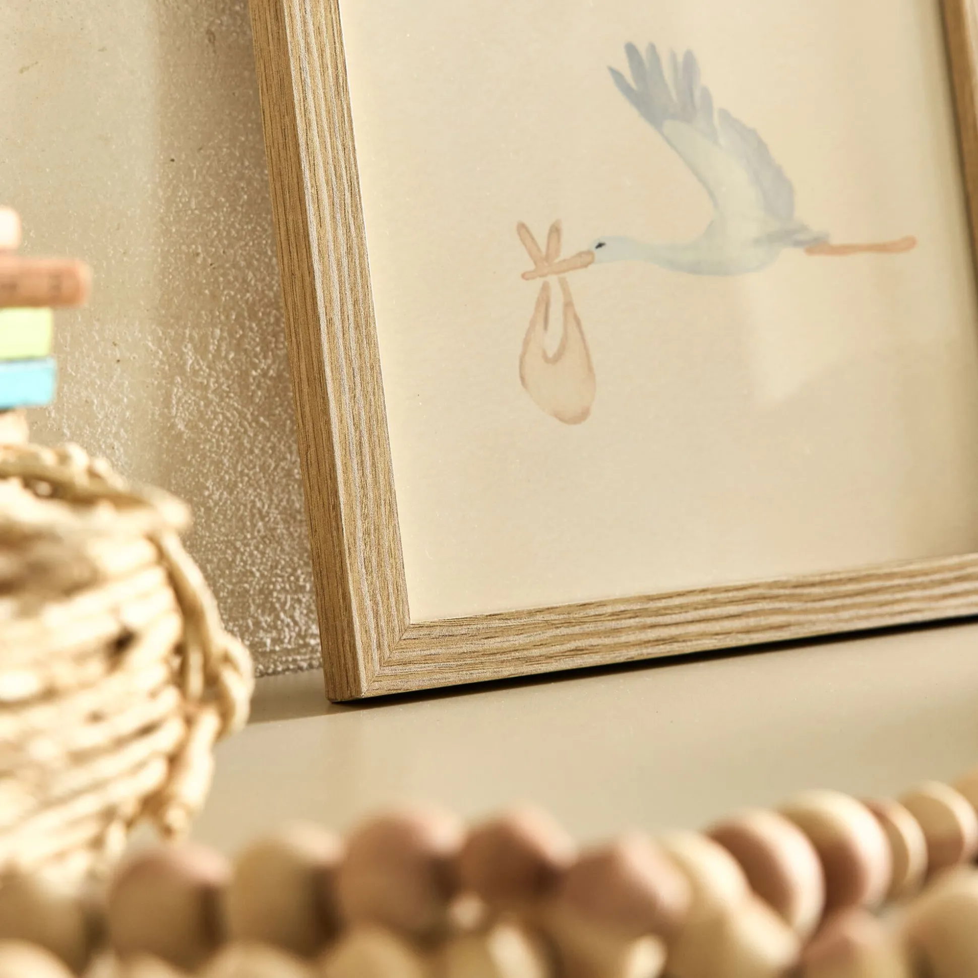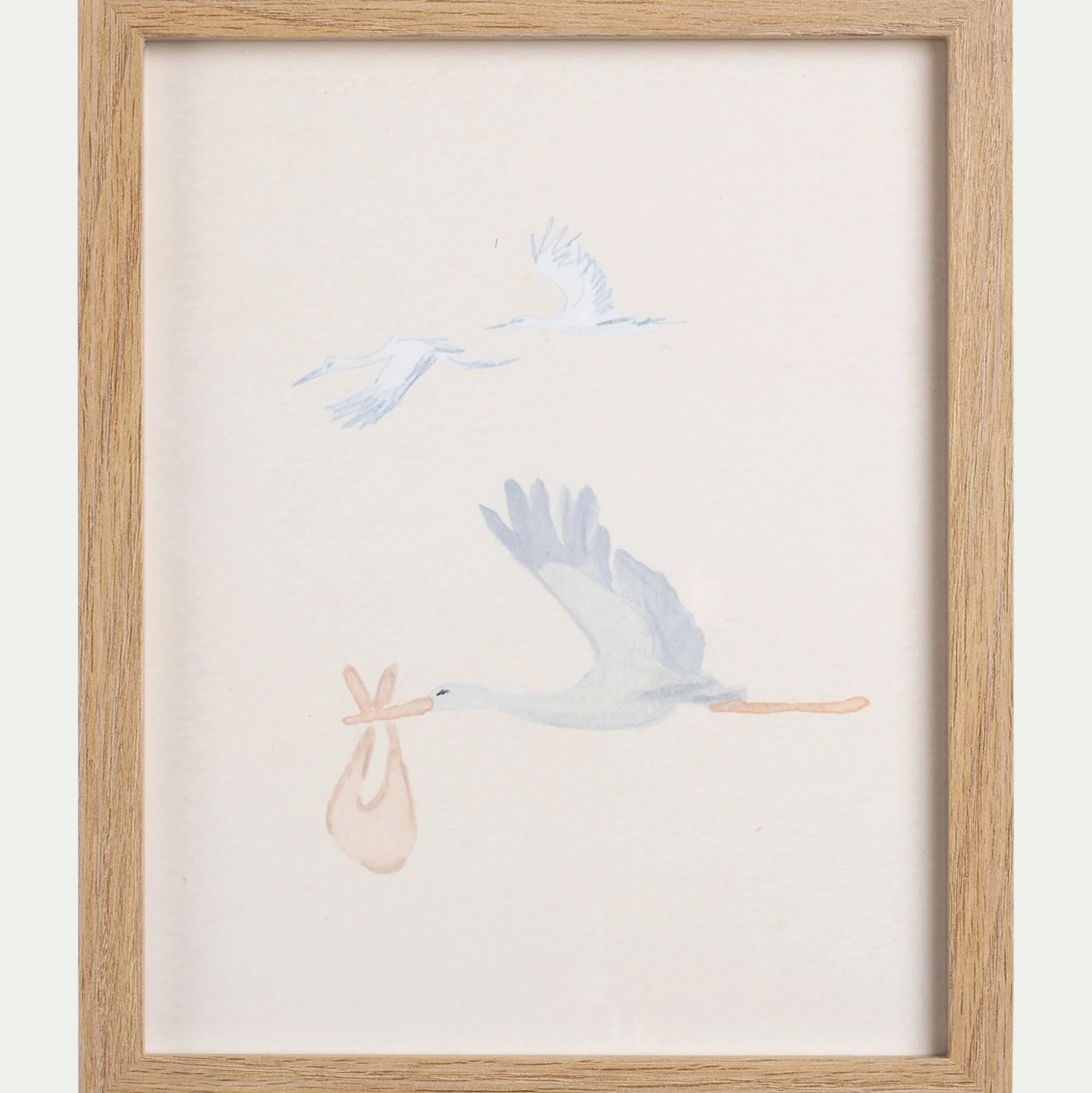 Illustration encadrée motif cigognes 22x27cm – bois clair