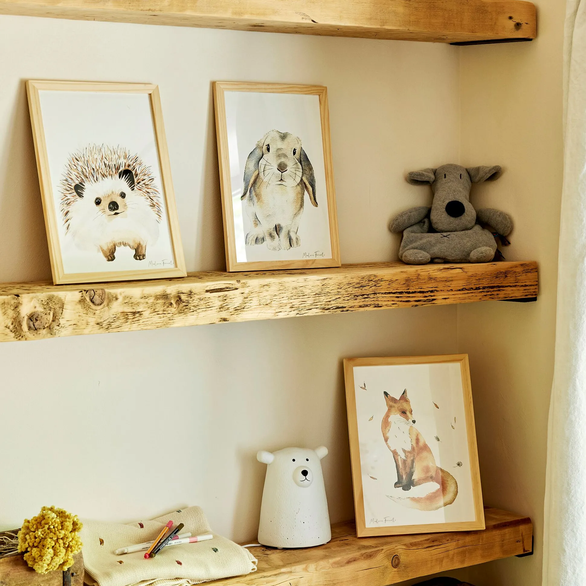 Découvrez “Les aquarelles de Marlène”, de jolies peintures d’animaux réalisées avec des teintes naturelles et encadrées qui viendront égayer la chambre de votre enfant. Des traits doux, des visages amicaux pour créer une ambiance cocooning et enchantée afin de stimuler l’imagination des plus petits tout en les rassurant. La girafe, le renard, l’éléphant ou encore le lapin s’invitent joyeusement sur les murs de la chambre à coucher pour un intérieur chaleureux.