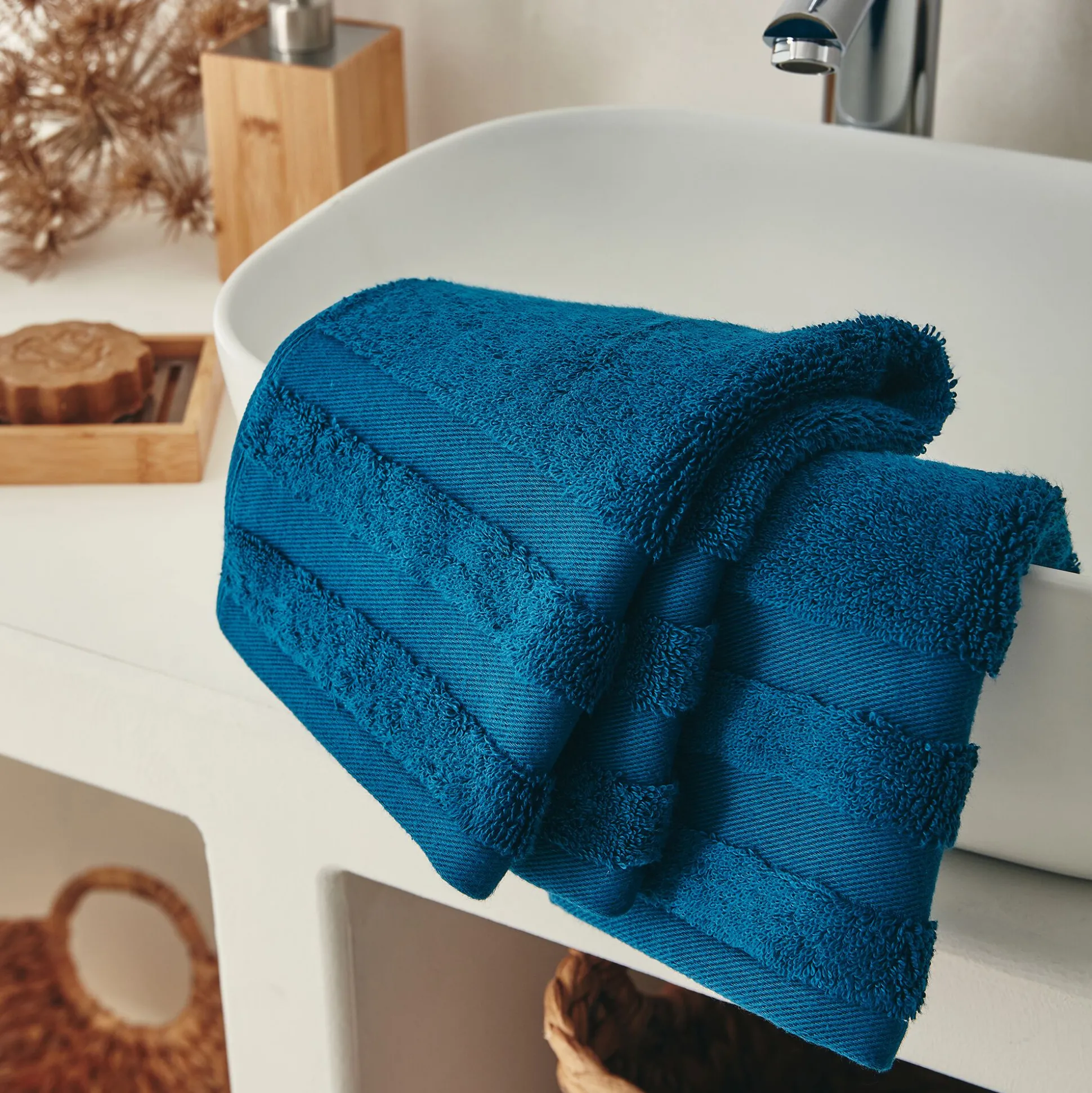 Découvrez la gamme de linge de toilette Rania. Elle vous accompagne au quotidien. Ici, nous vous présentons un lot de 2 serviettes invité dans un coloris bleu figuerolles. C’est un souffle d’air marin qui s’invite dans votre salle de bains. Faisant preuve d’une grande résistance à l’usage, ces serviettes de douche 100% coton fabriqués au Portugal sont une source de tendresse et délicatesse pour votre peau lorsque vous vous lavez. Dans la même collection, retrouvez aussi des draps de bain, serviettes de bain et gants de toilette, afin de créer un bel ensemble. Cette gamme existe dans un autre coloris.