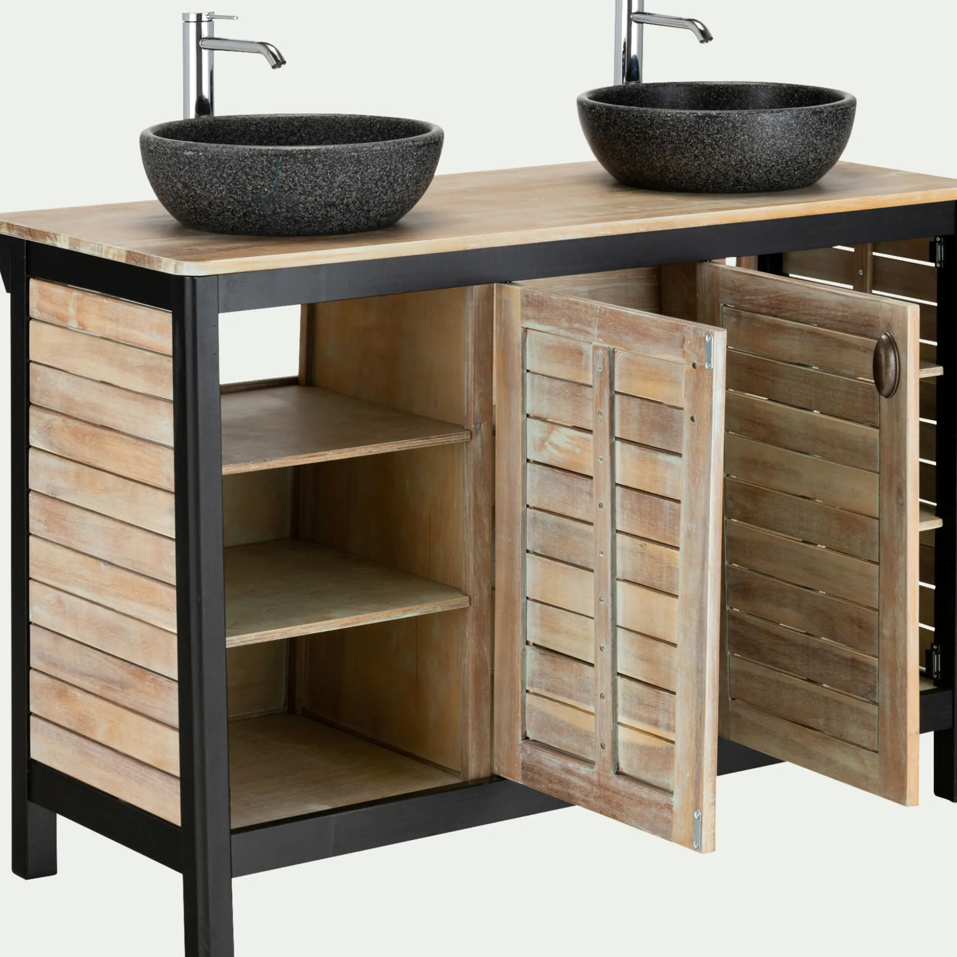 Découvrez cette gamme de mobilier pour salle de bains aux tendances exotiques. En acacia massif, ce meuble sous-vasque de 120cm ajoutera une touche décorative et vous permettra de ranger votre linge de toilette grâce à ses 6 belles étagères. Vous n’aurez plus qu’à sélectionner 2 vasques à poser ainsi qu’une robinetterie de votre choix pour parfaire l’ensemble.