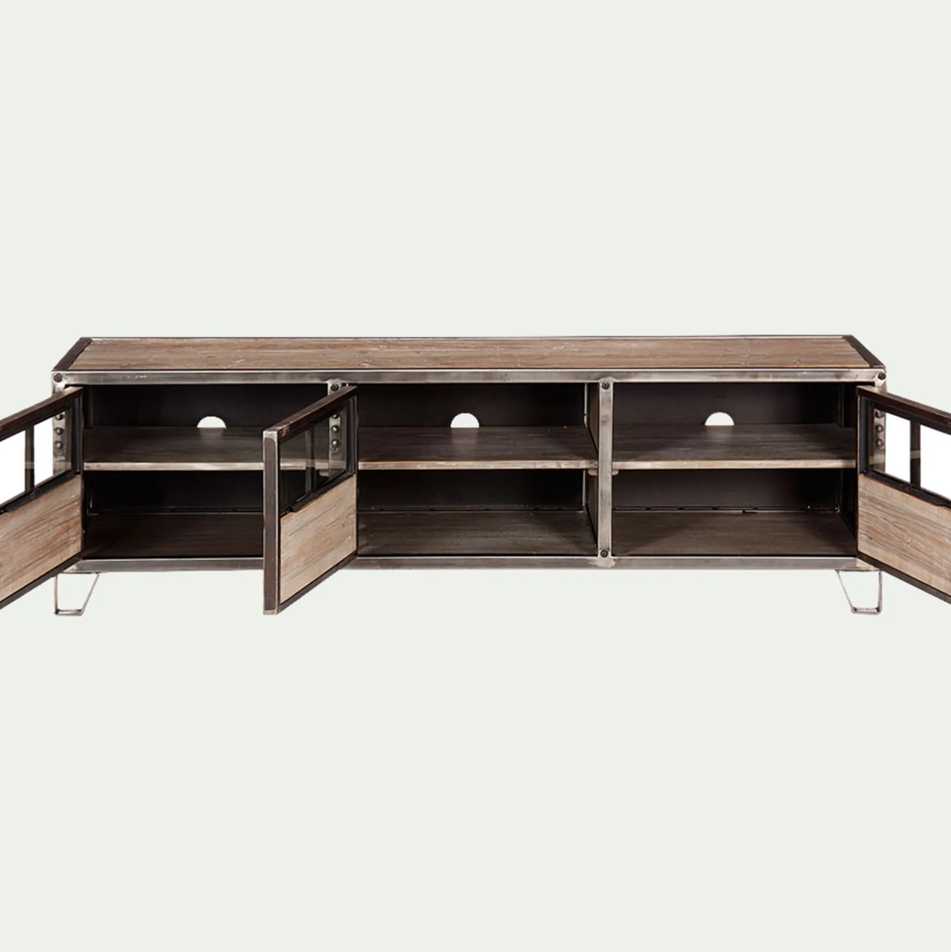 Cette collection de meubles, au style industriel très tendance, donnera du cachet à votre intérieur. Vous apprécierez le mélange de matières de ce beau meuble TV avec 3 portes en pin, acier et verre. Ses compartiments pourront accueillir votre box ADSL, vos consoles des jeux ou tout autres objets de décoration. Il donnera du cachet à votre salon et s’accordera parfaitement avec le reste de vos meubles.