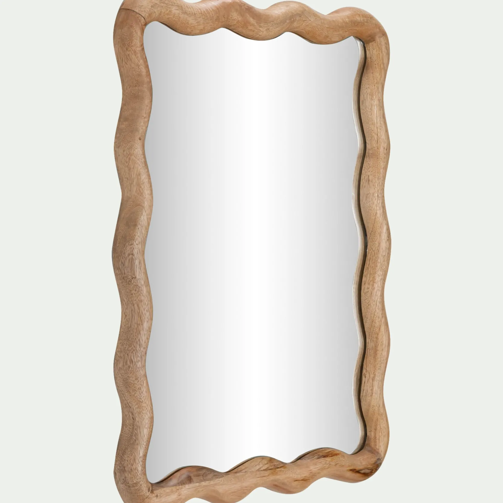 Le miroir mural Alana attire immédiatement le regard avec son encadrement ondulé en bois de manguier. Sa forme fantaisie lui confère une allure singulière et décorative, idéale pour habiller un mur avec originalité. De 51×63 cm, il se suspend facilement et devient une pièce maîtresse naturelle dans la déco intérieure.