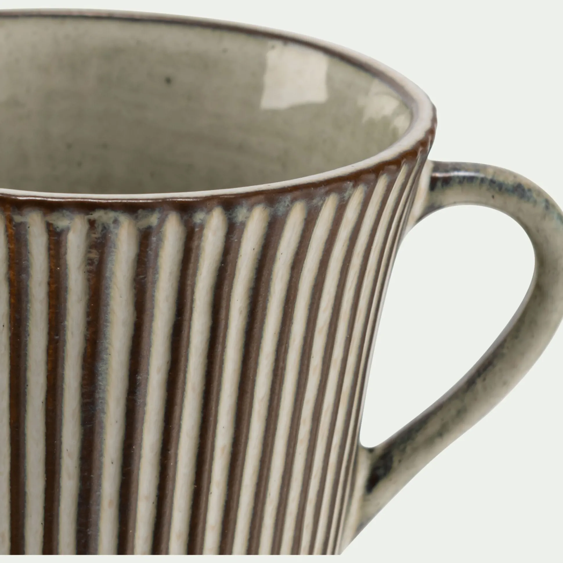 Une bonne journée commence avec un petit-déjeuner réussi. Munissez-vous du mug Listrado pour déguster café, thé ou chocolat chaud. Cette céramique portugaise arbore une silhouette légèrement évasée, accompagnée d’une anse traditionnelle. Ce mug en grès réactif est également orné d’un motif en relief : de belles rayures creusées dans l’épaisseur de la terre. Dans notre coloris marron écorce, ce mug de 50cl participe à un dressage au style naturel et contemporain.