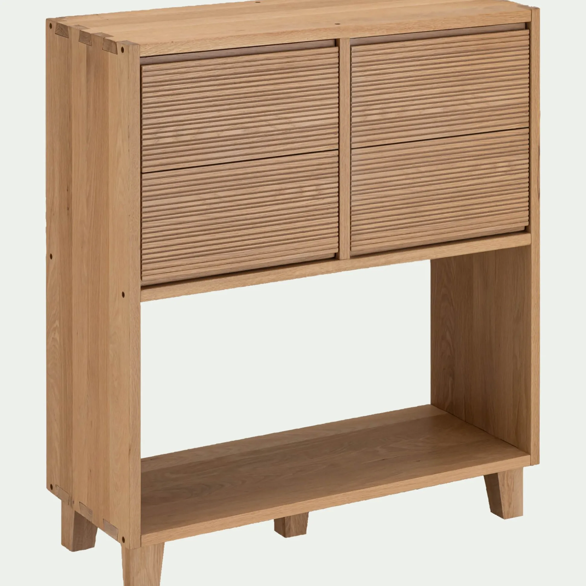 Compact et plein de personnalité, le petit buffet Tassia revisite le rangement avec élégance et fonctionnalité. Il se compose d’un meuble 3 cases en chêne certifié FSC®, agrémenté de deux tiroirs striés qui apportent du rythme à la façade tout en conservant une belle discrétion. Le travail du bois crée un jeu de textures subtil, idéal pour dissimuler vos objets du quotidien avec style. Élevé par des pieds en chêne, il affiche une allure à la fois intemporelle et chaleureuse. Pratique et adaptable, Tassia s’intègre aisément dans une entrée, un salon ou une salle à manger. Avec son design épuré et personnalisable, il s’adapte à vos envies pour créer un meuble unique, pensé pour durer et évoluer à vos côtés.