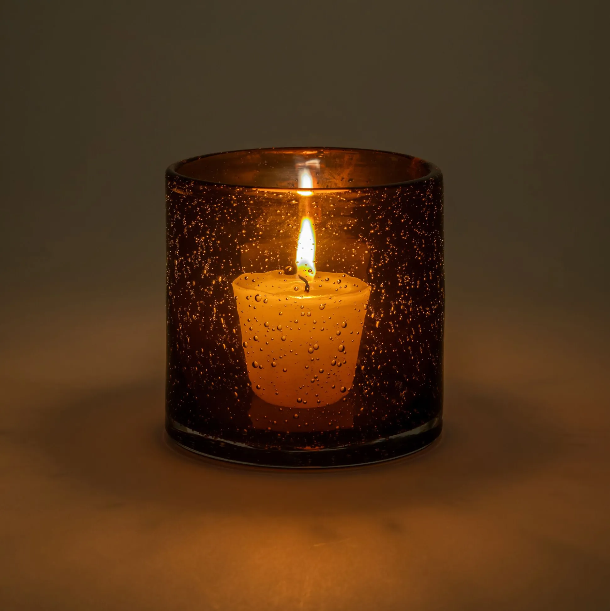 Ce photophore en verre bullé diffuse une lumière douce et enveloppante, parfaite pour créer une ambiance chaleureuse à la tombée du jour. Parsemé de fines bulles emprisonnées dans la matière, ce photophore donne à la flamme de la bougie une présence presque magique. Haut de 10 cm, il trouve sa place aussi bien sur une table ou un rebord de fenêtre. Sa teinte brun rustrel, profonde et naturelle, s’accorde idéalement dans plusieurs styles d’intérieur.