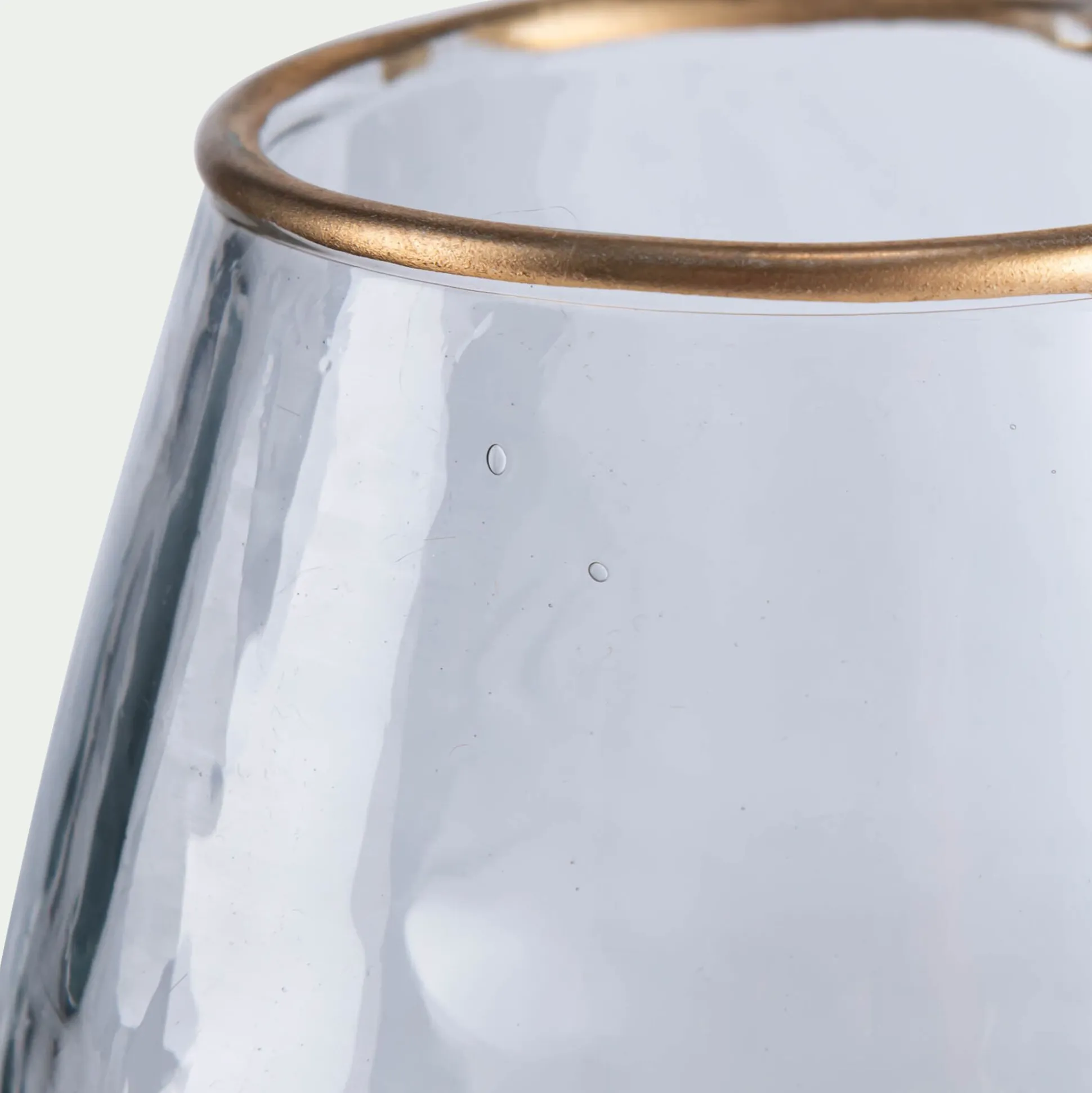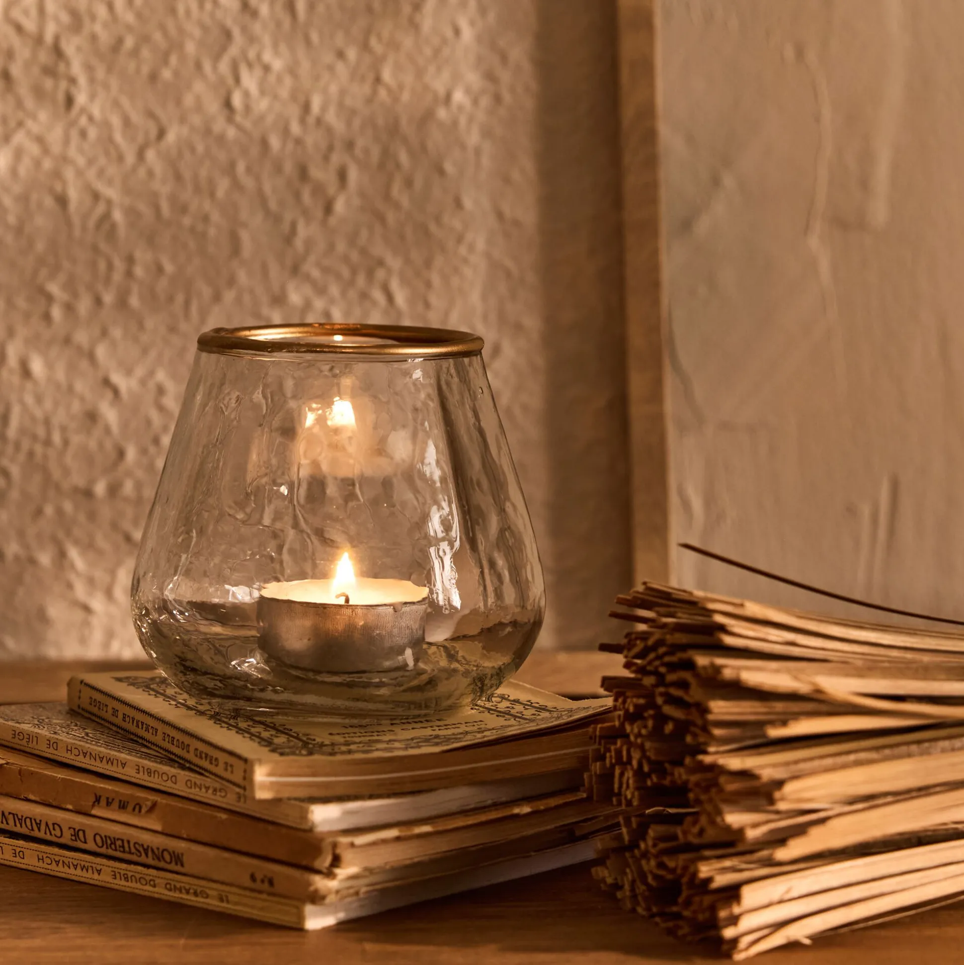 Épuré et élégant, le photophore Tiros se distingue par sa simplicité. En verre transparent, il laisse entrevoir la bougie en son cœur. La lueur de la flamme est parfaitement mise en valeur et éclaire généreusement l’espace. Un fin liseré doré vient souligner la bordure de ce petit photophore et lui apporter un éclat festif, parfait pour une grande occasion.