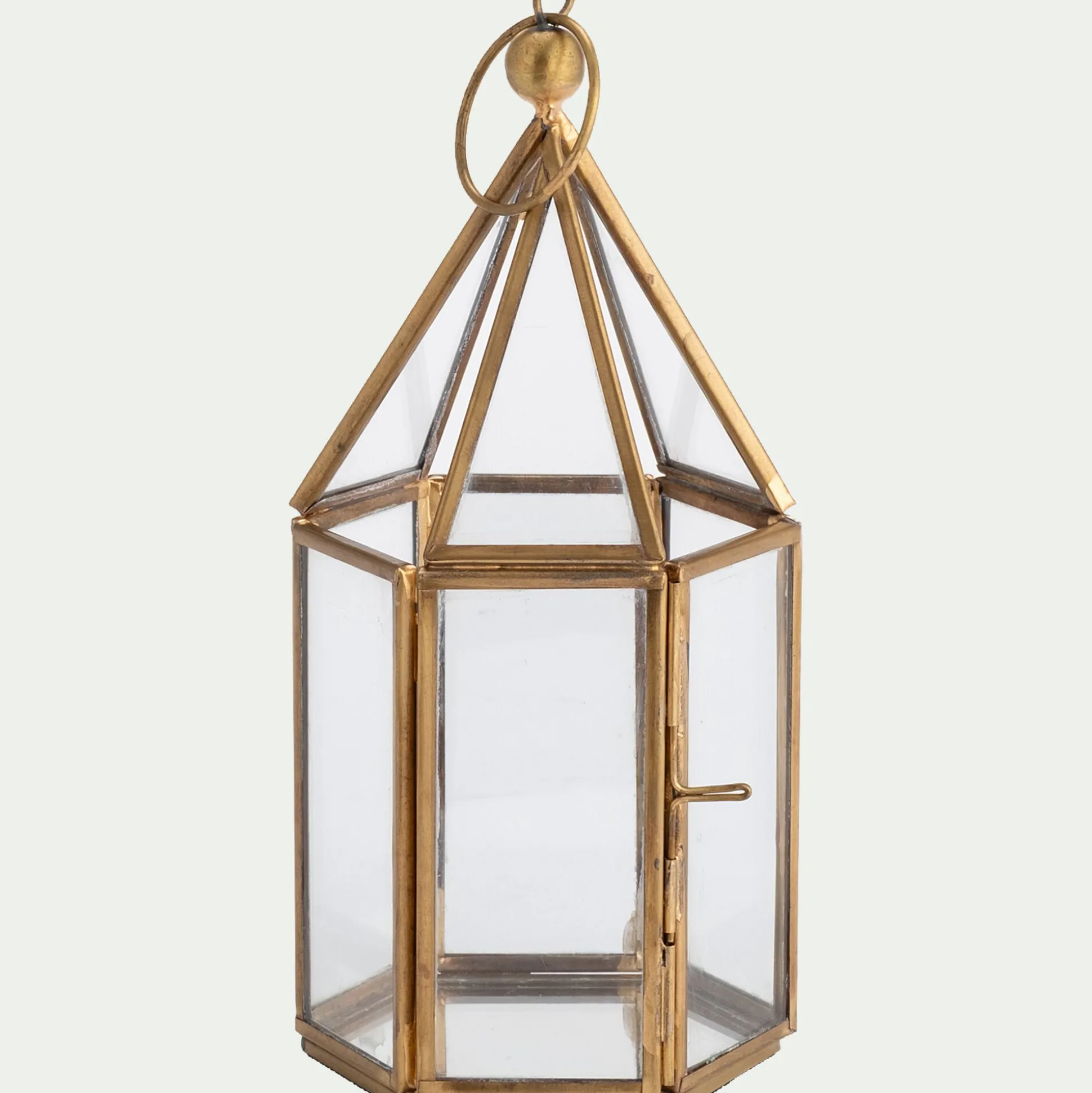 Laissez-vous charmer par cette lanterne photophore au design raffiné, mêlant le verre transparent à la délicatesse du laiton doré. Sa structure hexagonale en verre encadrée par des montants en laiton rappelle l’élégance des luminaires d’inspiration orientale, parfaite pour une ambiance chaleureuse. Posée sur une console ou une table d’appoint, cette lanterne décorative diffuse la lumière de votre bougie chauffe-plat avec une douceur unique. Grâce à sa poignée anneau, elle peut être facilement déplacée pour éclairer un coin de pièce ou créer une atmosphère intimiste sur un balcon pendant les fêtes. Elle s’harmonise aisément avec d’autres objets de décoration en métal ou en verre pour composer un intérieur au style intemporel. Adoptez ce photophore pour ajouter une touche d’éclat discret et d’élégance à votre maison.