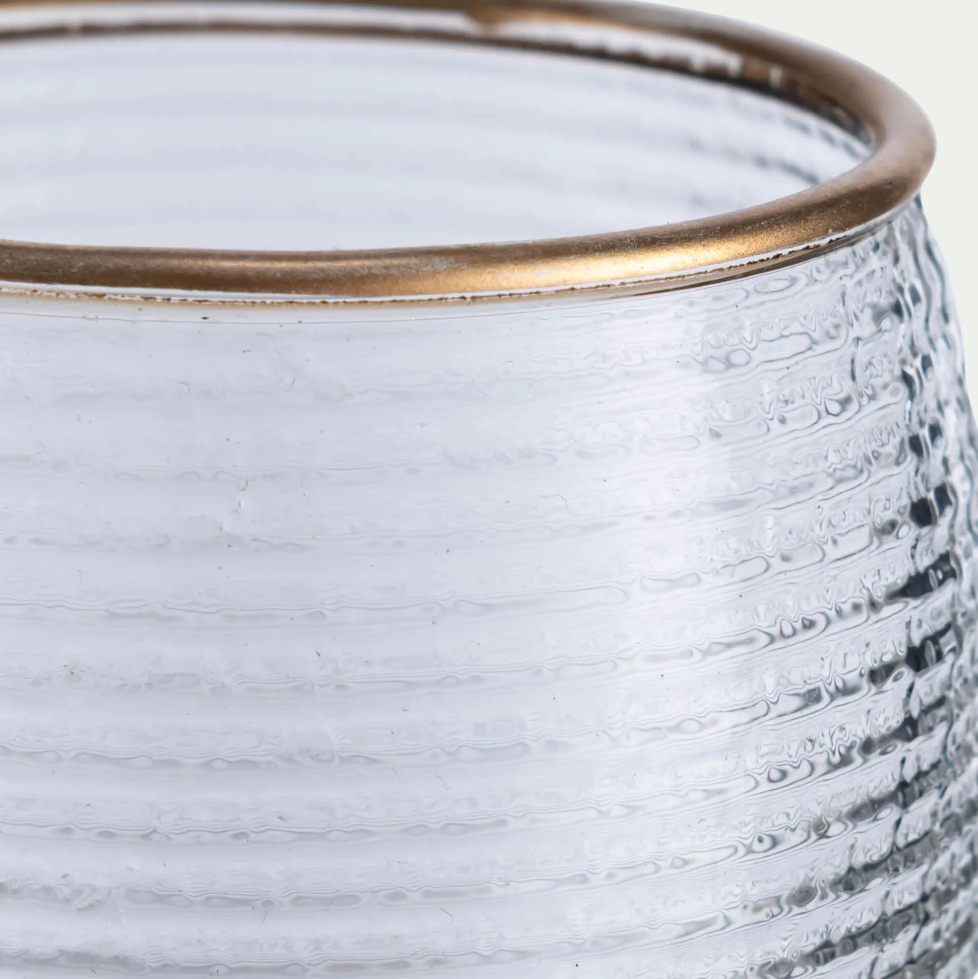 Tout en rondeur, le photophore Solias se distingue par sa matière striée. Le verre transparent est subtilement travaillé pour offrir de la texture, ainsi qu’un effet visuel sur la lueur de la bougie. Ce petit photophore arbore un liseré doré, finition élégante qui convient parfaitement à une décoration festive.