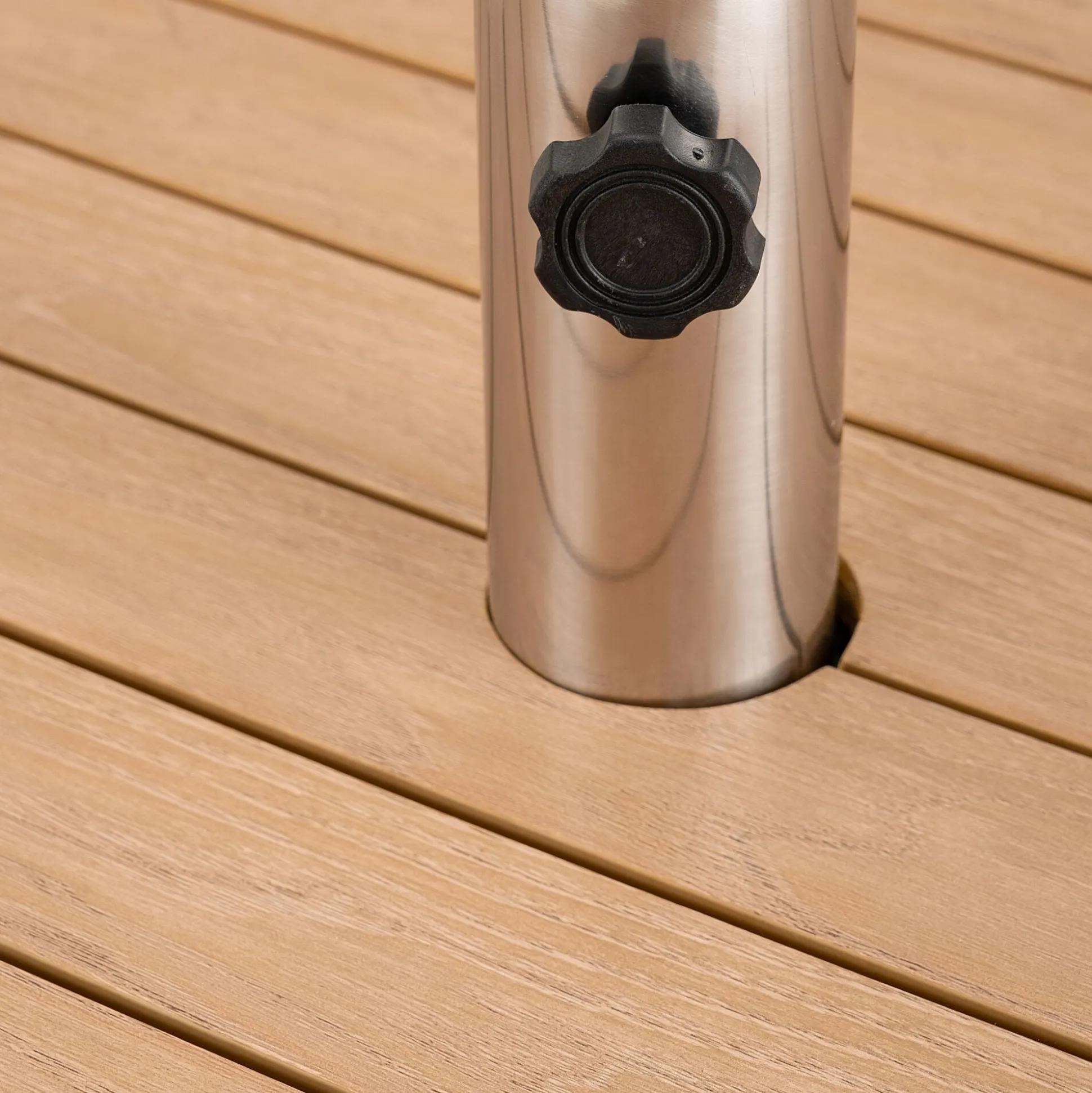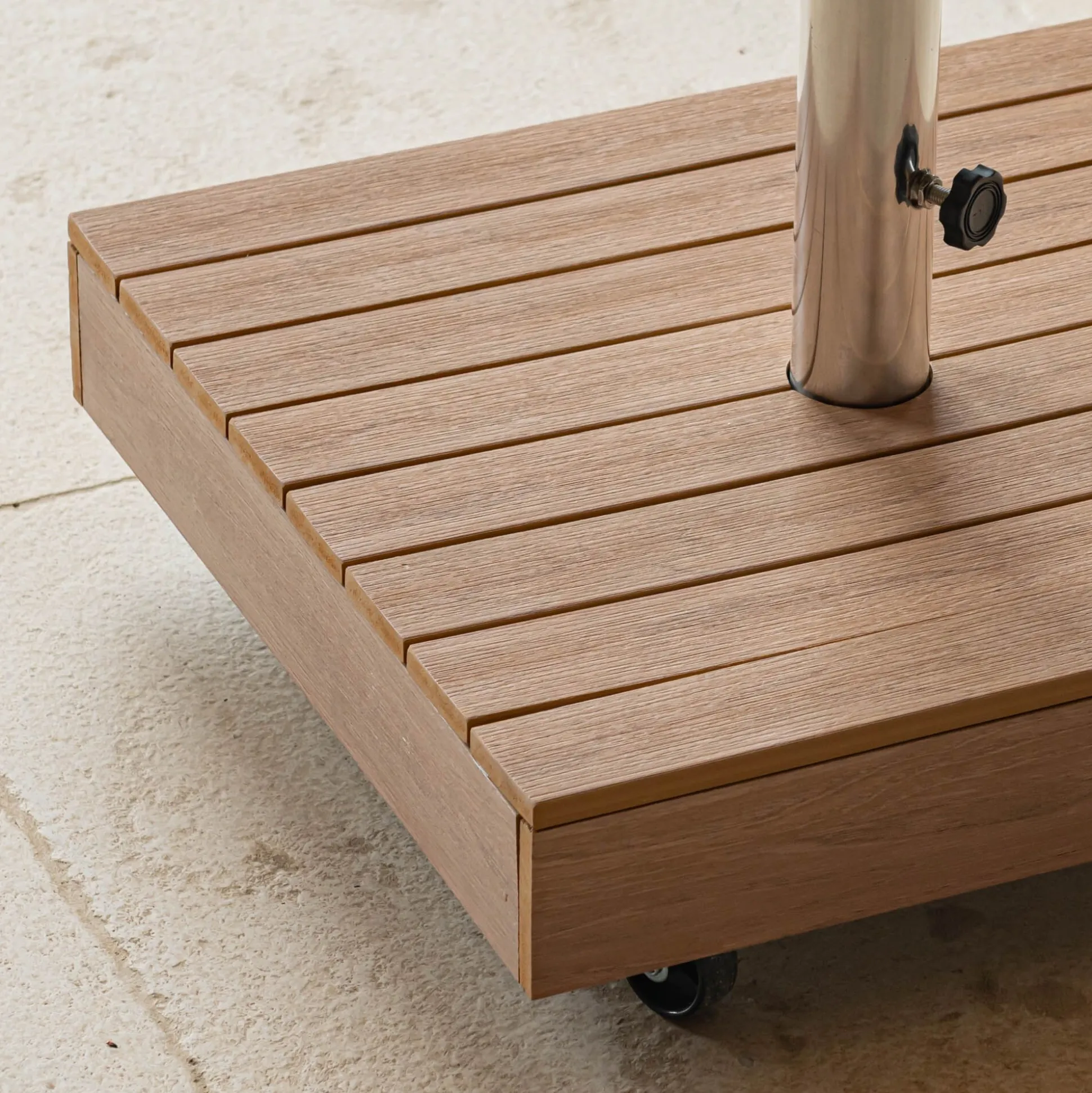 Avec ses 36 kg de béton, ce pied de parasol assure un ancrage solide pour profiter de l’ombre en toute sérénité. Son coffrage en lattes de bois ajoute une touche chaleureuse et authentique à l’espace extérieur. Facile à déplacer grâce à ses 4 roulettes, il permet d’ajuster l’ombre au fil de la journée. Deux vis de serrage viennent compléter l’ensemble pour maintenir fermement le mât du parasol en place.