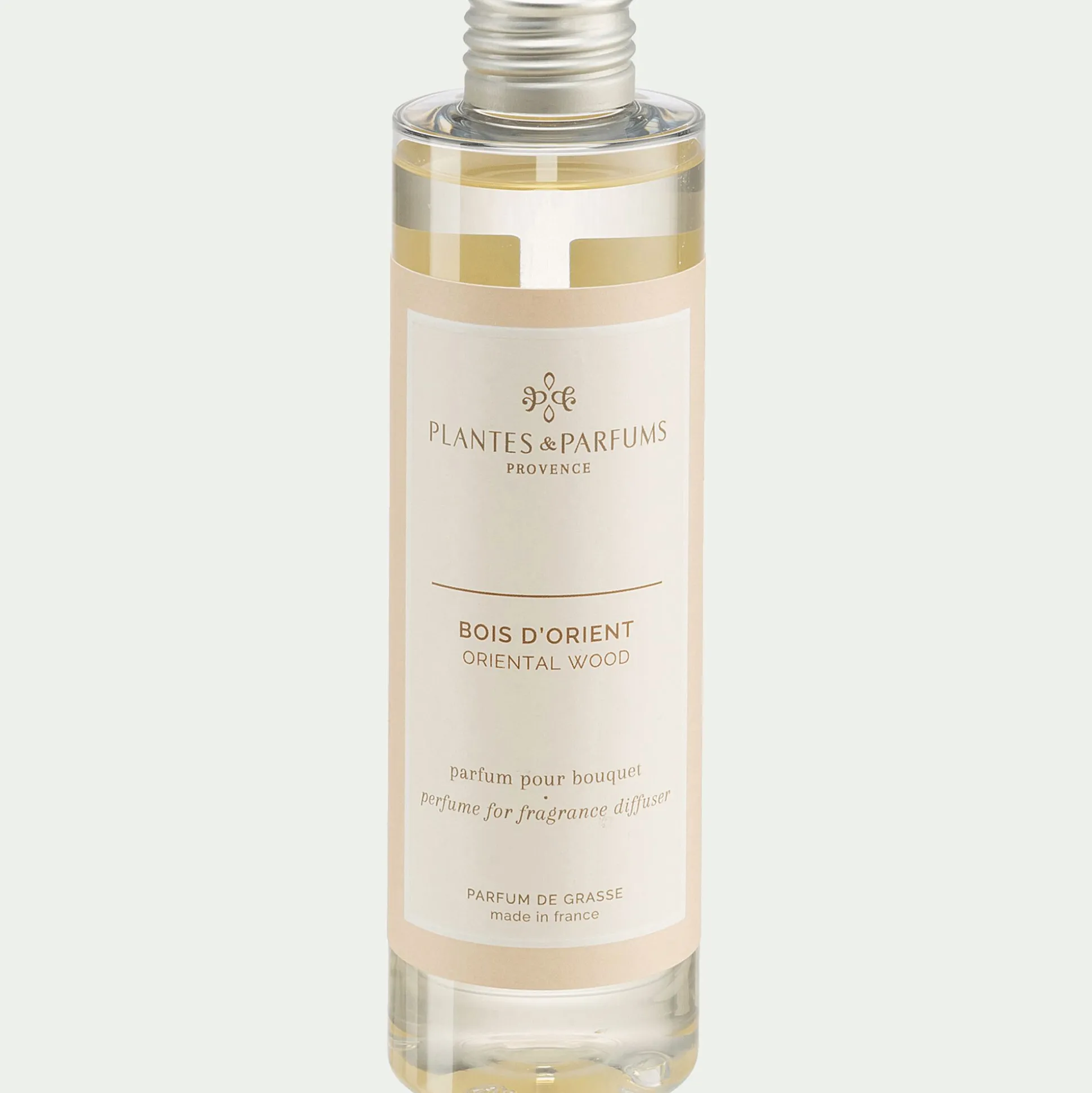 Prolongez ce moment suspendu aux arômes orientaux grâce à la recharge pour diffuseur Bois d’Orient. Profonde et puissante, elle diffuse des notes de tête teintées d’agrumes. Orange, romarin et bergamote s’entrelacent pour former un parfum aussi acidulé que doux. L’odyssée se poursuit à travers les notes citronnées du géranium qui s’associent à l’odeur épicée du patchouli et de la rose. Une senteur réveillée par des notes de fond masculines tirées du musc, de la fève tonka et de la vanille pour une fragrance altière et intense. Un véritable récit oriental qui bercera votre intérieur dans une atmosphère langoureuse et feutrée.