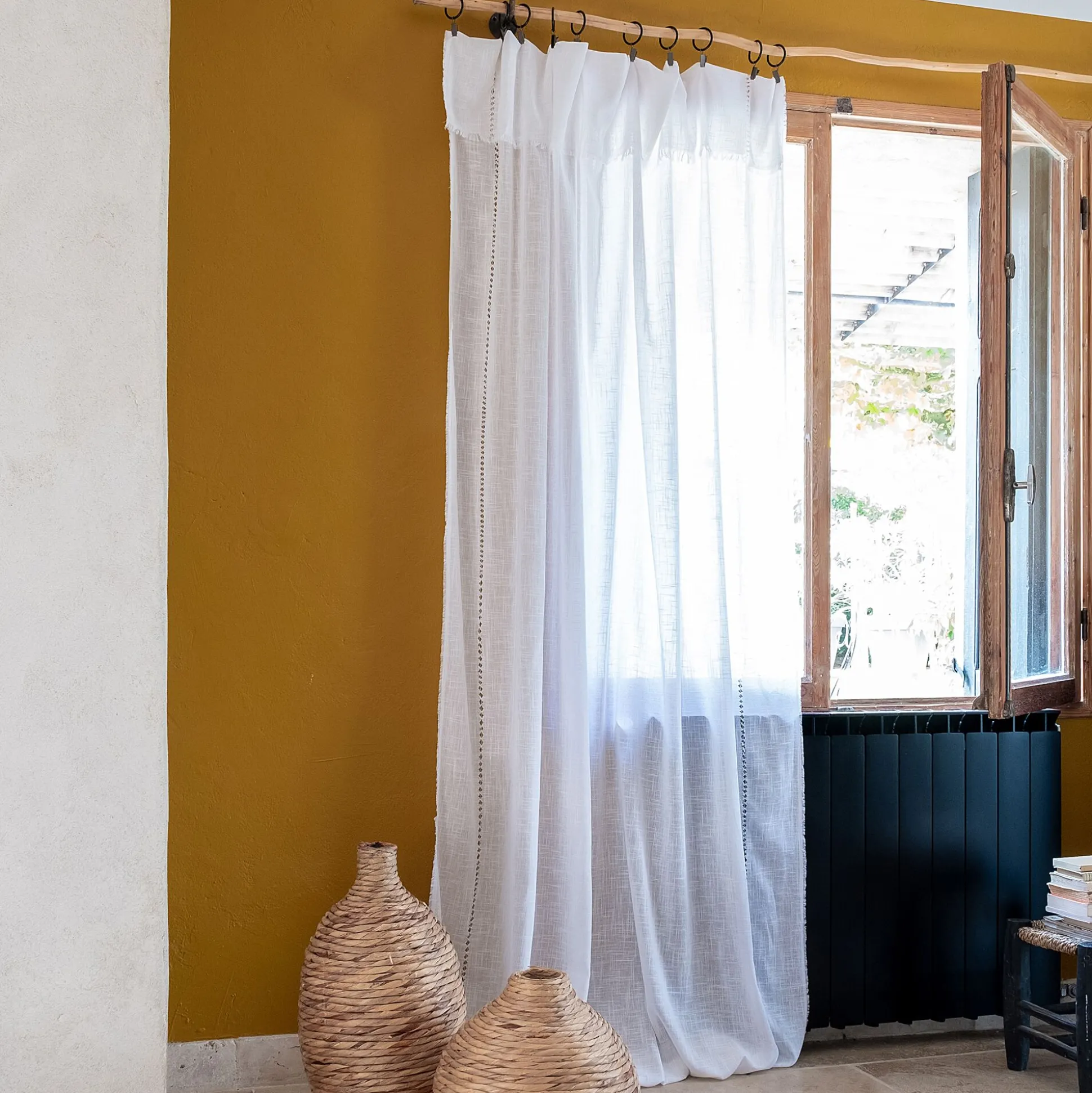 Tamisez votre pièce tout en la décorant grâce à ce rideau blanc. Ce rideau de 140×280 cm recouvrira toute la superficie de vos fenêtres afin d’obscurcir légèrement votre intérieur en filtrant les rayons du soleil. Avec son joli tissu en coton à la finition ajourée et avec des petites franges, il vous permettra également de décorer votre maison en y ajoutant des détails subtils. Accrochez-le à une jolie tringle grâce à un système d’attaches à anneaux pinces Brenon et créez une décoration délicate et élégante.