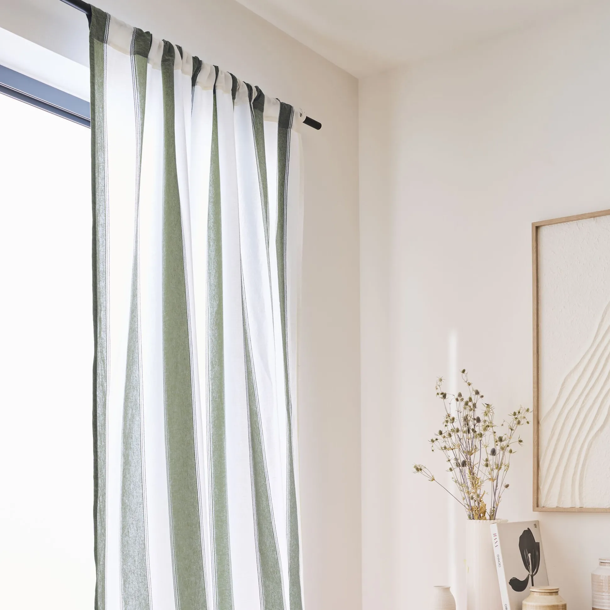 Apportez une touche déco en toute discrétion et délicatesse à votre intérieur avec ces rideaux à rayures vert et blanc. En lin et coton de haute qualité, ils sont confectionnés avec soin au Portugal et témoignent d’un savoir-faire. Ils vous permettront de sublimer votre maison avec charme et authenticité. En 140×250 cm, leur tissu laisse passer la lumière tout en préservant votre intimité pour une ambiance tamisée. Ces rideaux sont le mariage entre élégance et durabilité. Leur matière naturelle et leur doux coloris créent une atmosphère lumineuse et apaisante dans votre pièce. Idéaux pour habiller vos fenêtres avec subtilité, ils s’adapteront à une déco naturelle ou moderne.