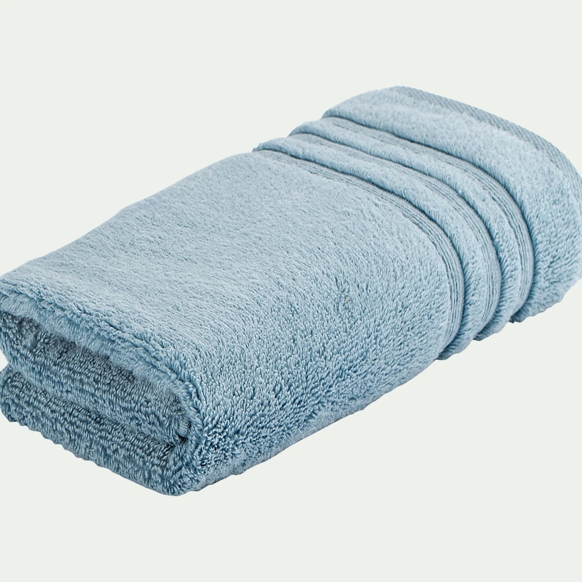 Laissez entrer dans votre salle de bains un monde de douceur avec la gamme de linge de toilette Noun. Découvrez cette serviette de bain avec une bouclette en éponge « zéro torsion » résultant d’un tissage très rigoureux et fabriquée au Portugal. Son coloris bleu autan apporte une note de charme à la salle de bains. Complétez-la avec le reste de la collection : serviette de bain invité, gants de toilette et drap de bain. Découvrez cette gamme dans une autre couleur.