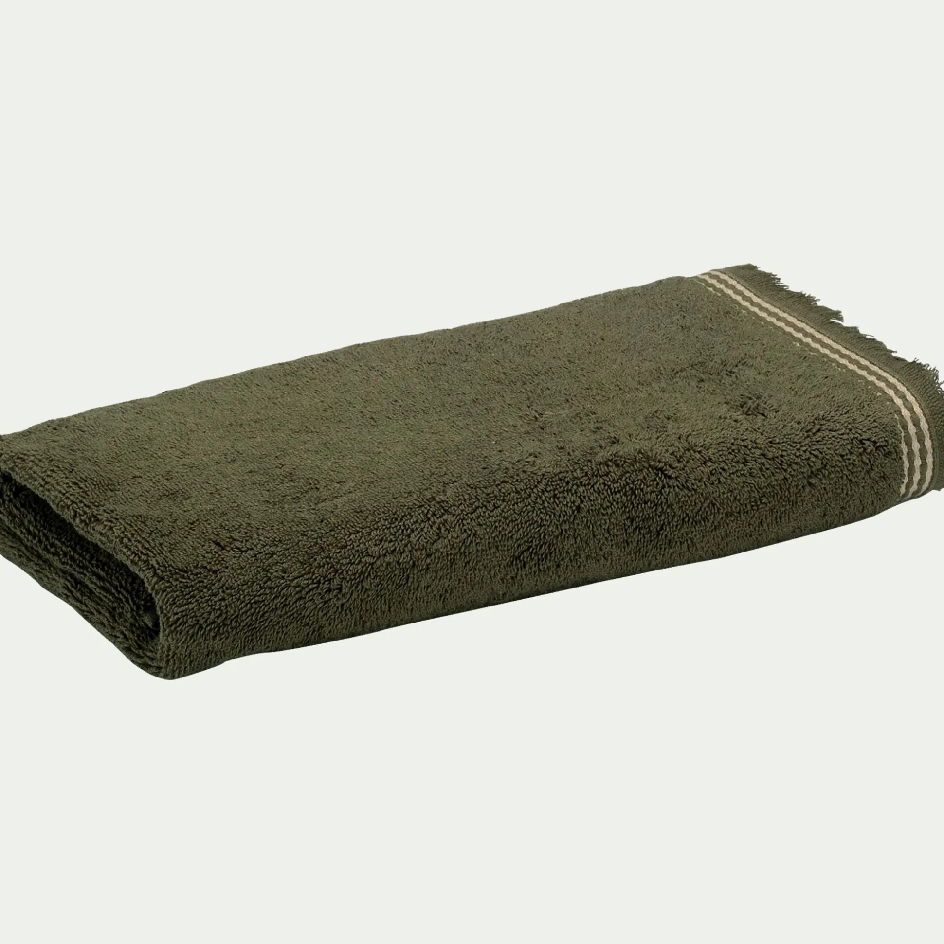 La serviette de toilette Amandine, en coton épais de 600g, enveloppe la peau d’une douceur réconfortante, tout en offrant un grand pouvoir absorbant. Son coloris vert cèdre insuffle une touche naturelle à la salle de bain, tandis que son liteau beige et ses franges délicates ajoutent une touche d’élégance. Fabriquée au Portugal, cette grande serviette de toilette de 50×100 cm allie élégance et qualité durable pour des moments de bien-être au quotidien.