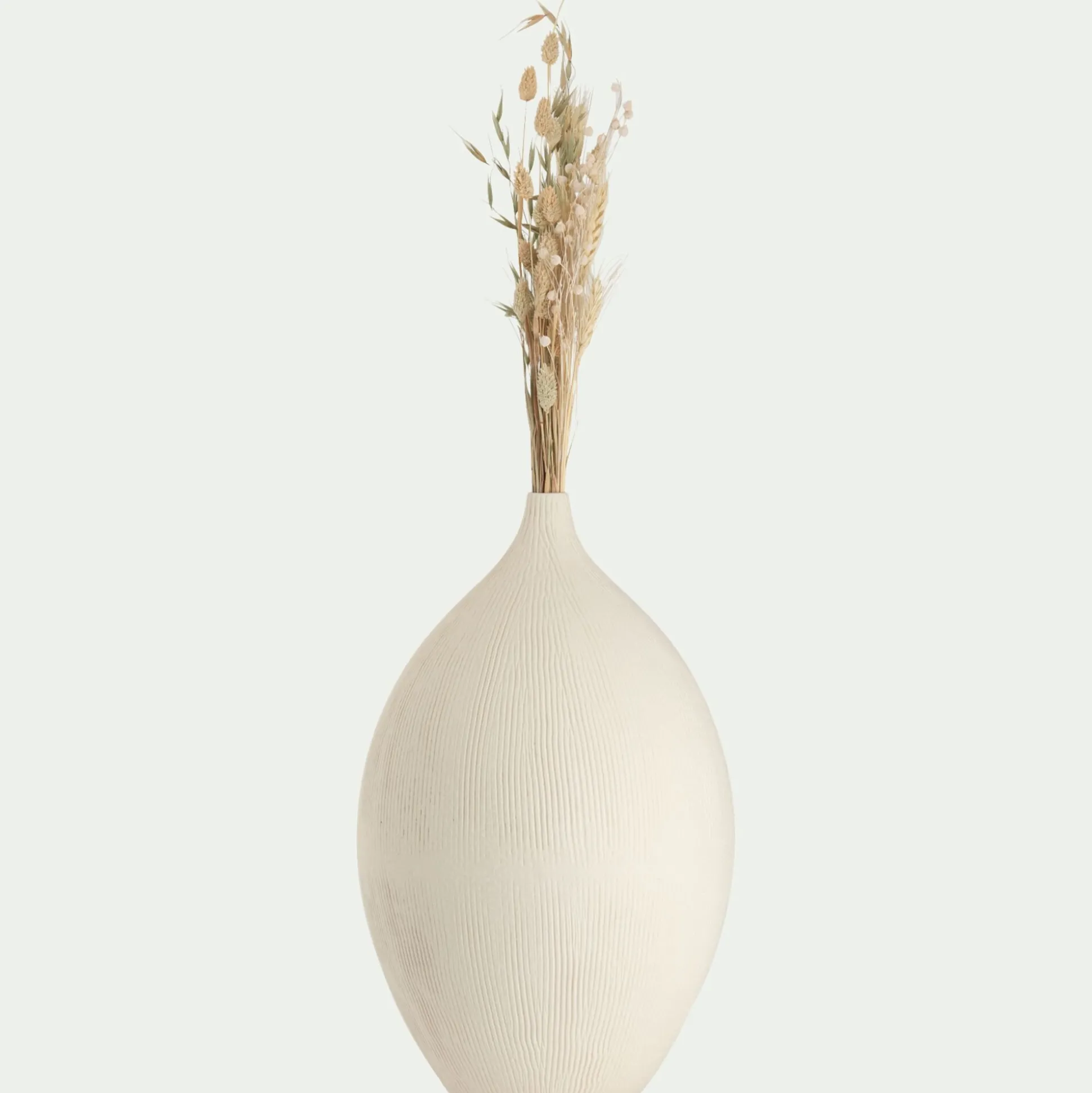 Coup d’éclat dans votre décoration, le vase en faïence Anas illumine votre intérieur de sa blancheur radieuse. Ce grand vase de 44 cm de haut affiche une surface brute, striée de lignes fines qui viennent apporter de la texture à cet objet déco. Ses volumes sont généreux et forment une décoration opulente à mettre en scène au centre d’une table ou sur un buffet. Ce vase blanc tout en rondeur et d’aspect rustique vient texturer votre décoration de sa rugosité. Anas, un vase déco austère et pourtant riche de sa douceur.