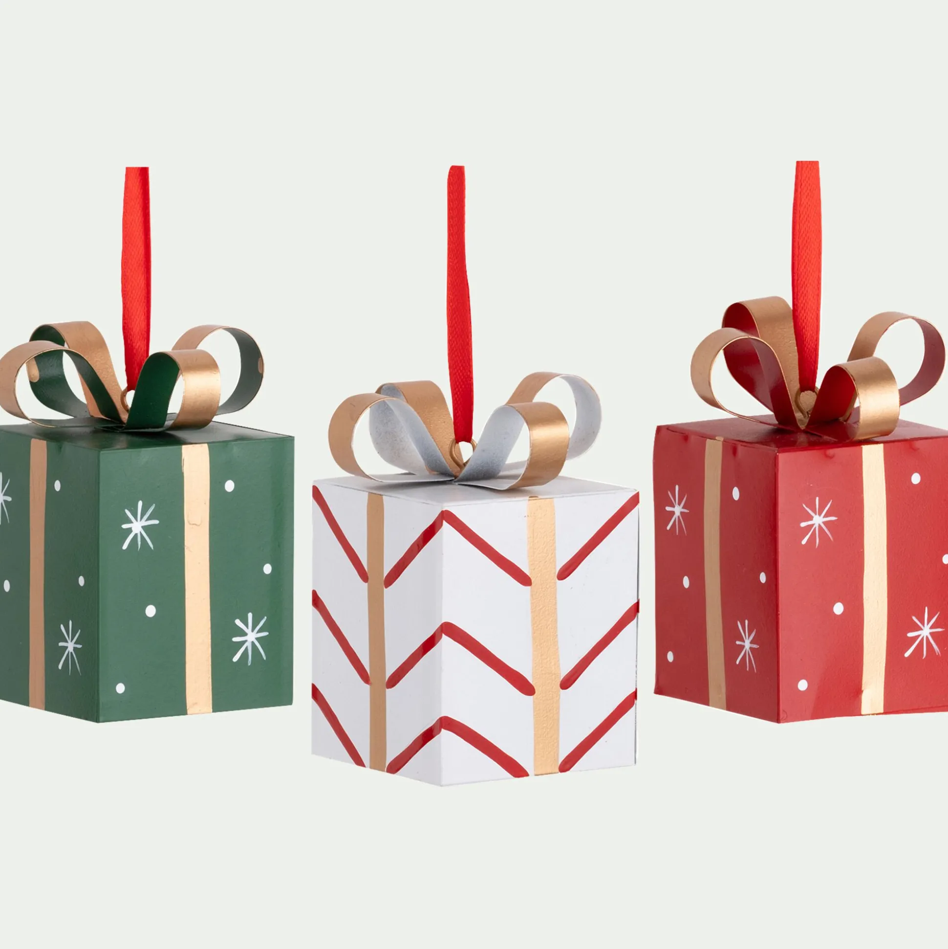 Ajoutez une touche ludique et festive à votre décoration avec ces adorables suspensions de Noël en forme de petits cadeaux. Fabriquées en fer, leur matière assure une bonne tenue et un look original sur les branches de votre sapin. Cet assortiment propose des motifs et des couleurs de Noël classiques (rouge, vert et blanc) ornés de rubans dorés ou argentés, parfaits pour créer un décor dynamique. L’achat de cette décoration se fait au modèle aléatoire, vous offrant la surprise de découvrir lequel viendra illuminer votre intérieur. Multipliez ces petites boîtes cadeaux sur le sapin pour évoquer l’esprit généreux des fêtes.