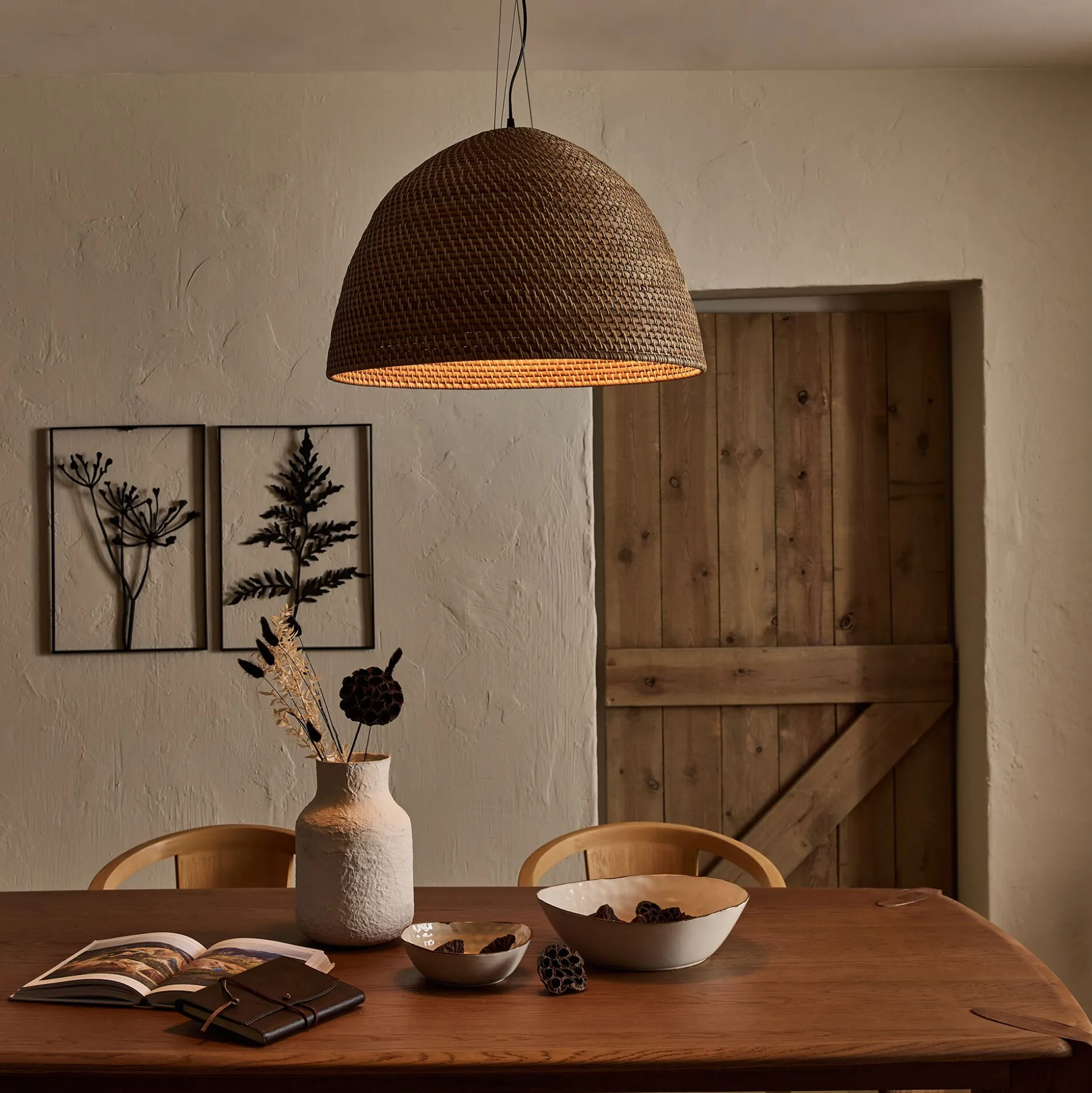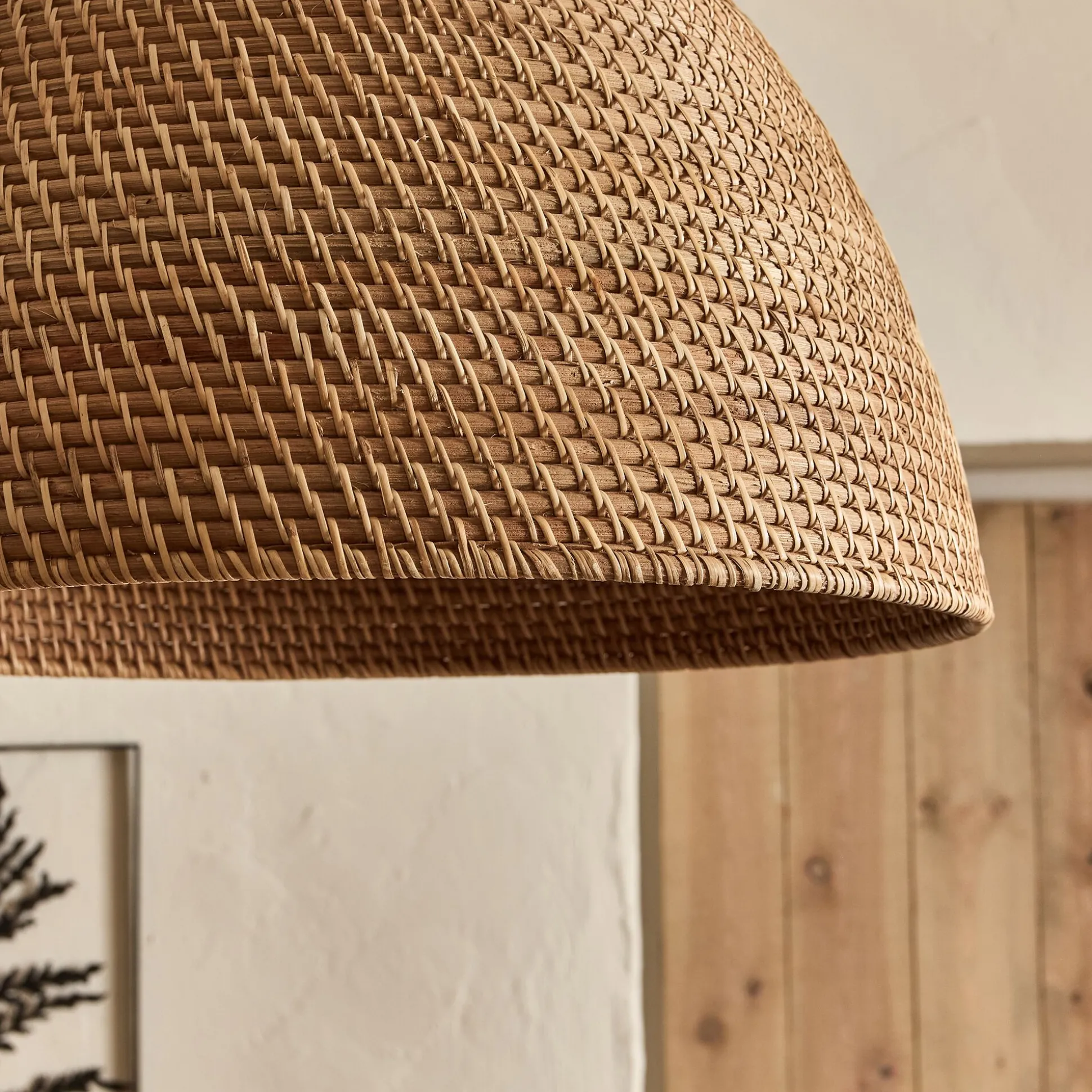 Cette suspension en rotin s’habille d’un abat-jour en forme de dôme, créant un jeu de lumière doux et chaleureux dans la pièce. Le tressage naturel du rotin diffuse la lumière avec finesse, insufflant une ambiance accueillante et apaisante. Vendue avec un câble en PVC, cette suspension électrifiée est prête à l’emploi — il ne reste qu’à ajouter une ampoule de votre choix pour compléter l’ensemble. Parfaite pour un salon, une chambre ou une cuisine, elle apporte une touche organique et authentique.