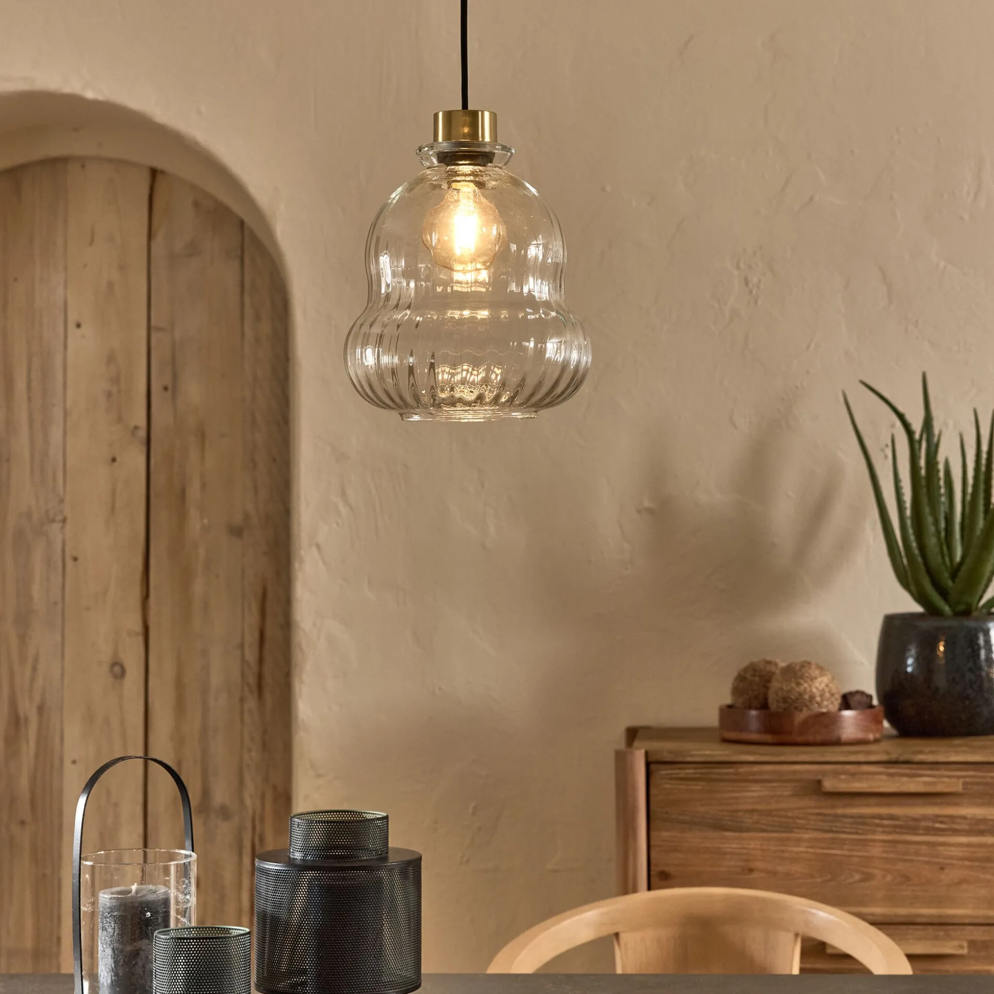 Cette suspension en verre transparent se distingue par sa forme organique aux courbes douces, qui évoquent la fluidité et l’élégance. L’abat-jour laisse généreusement filtrer la lumière, créant un éclairage clair et homogène, idéal pour un espace nécessitant un bon confort visuel, tel qu’un bureau ou une bibliothèque. Les finitions en laiton ajoutent une subtile touche dorée, rehaussant l’ensemble d’un éclat raffiné. Cette suspension électrifiée est à la fois moderne et intemporelle.