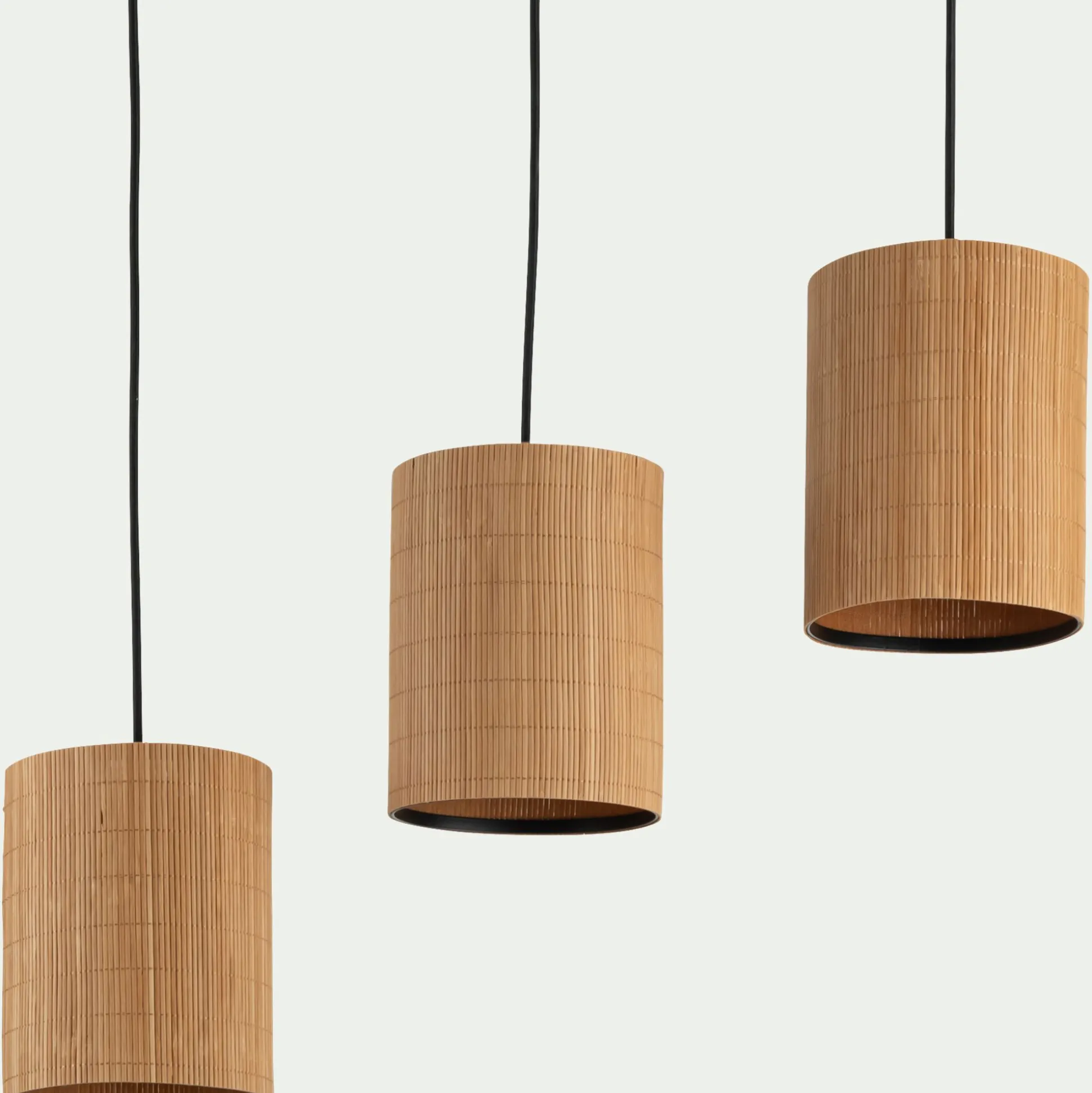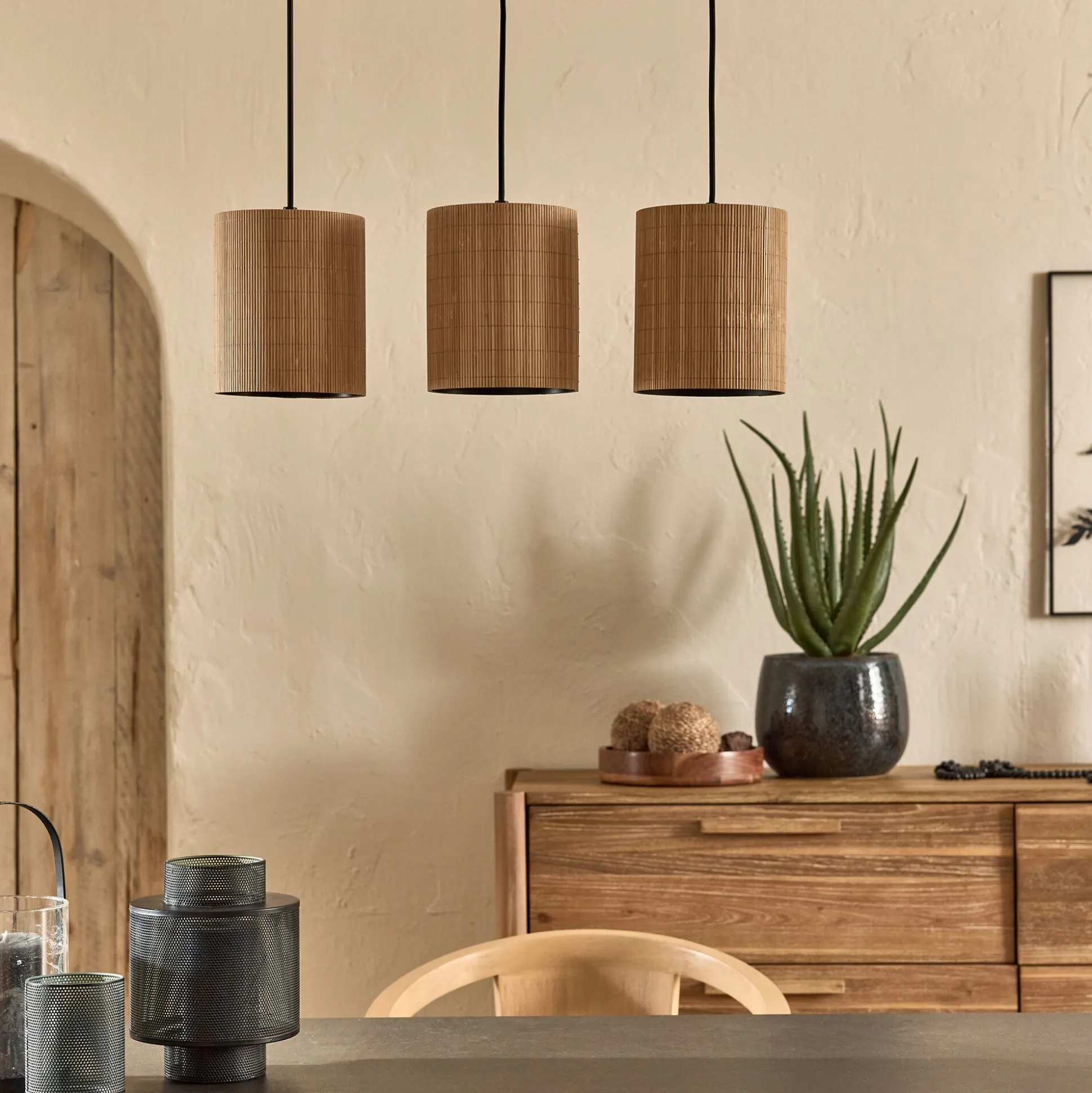 Piana est une suspension triple, c’est-à-dire une suspension électrifiée à 3 abat-jours. Réglables en hauteur, les abat-jours en bambou peuvent être alignés ou bien déstructurés selon le rendu souhaité. Cette touche naturelle et authentique s’associe à un système électrique noir pour un côté plus contemporain. Cette suspension en bambou est idéale au-dessus d’un ilot de cuisine ou d’une table de repas. Elle habille les hauteurs sous plafond et décore avec élégance.