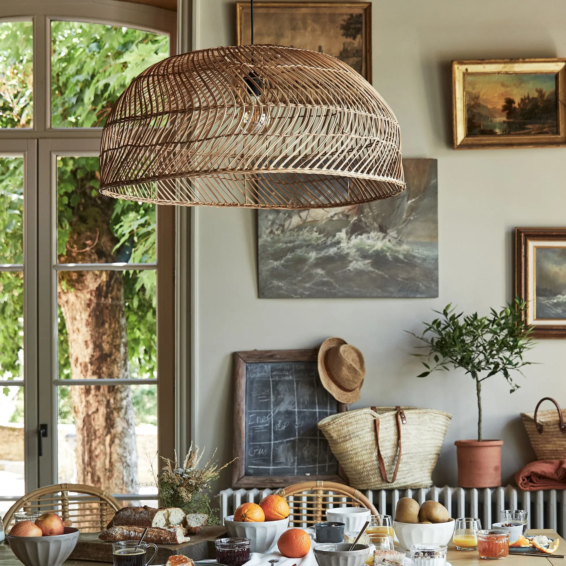 Mirna est une suspension naturelle, tressée à partir de fibres de rotin. Matériau souple, le rotin donne du mouvement à votre intérieur. Les fibres naturelles ondulent et donnent vie à un luminaire dynamique. A mi-chemin entre tradition et modernité, cette suspension en rotin insuffle chez vous un air de vacances. Son design bohème apaise votre intérieur. Particulièrement ajouré, ce luminaire en rotin laisse librement se diffuser la lumière. Cette grande suspension de 80 cm de diamètre est vendue sans système électrique ni ampoule.