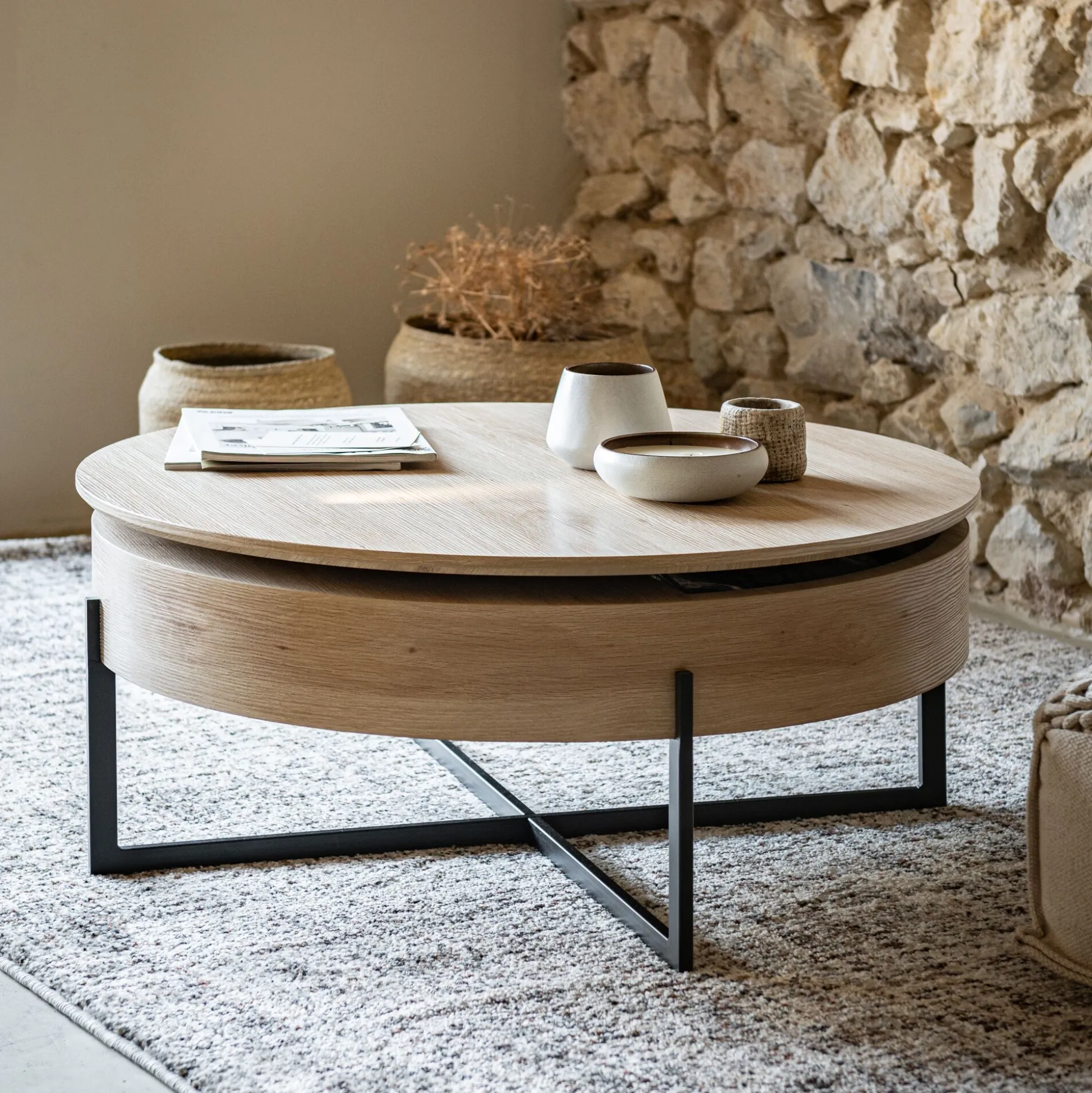 Optimisez votre salon avec la table basse Choucas. Cette table basse en bois comporte un caisson de rangement, dissimulé sous son plateau rotatif. Grâce à ce nouvel espace de rangement, votre séjour est mieux organisé. En bois clair, cette table basse ronde participe à une atmosphère naturelle et chaleureuse. Pratique et esthétique, c’est une pièce centrale du salon. Son piètement en métal noir croisé apporte du contraste à l’ensemble : la touche finale d’une meuble simple et au charme irrésistible.