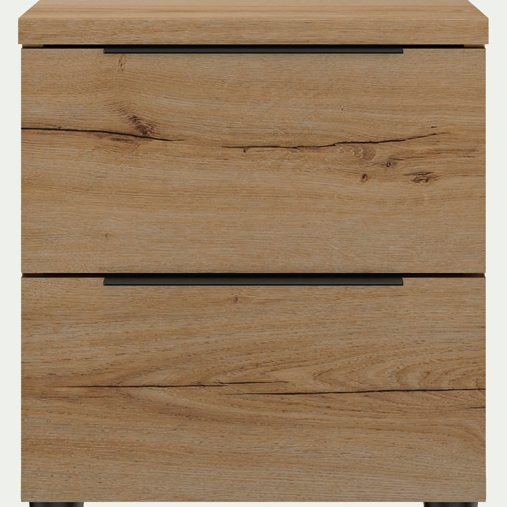Pour un coin nuit pratique et cocooning, rien de tel qu’une table de chevet en bois. La table de nuit Lucian permet d’exposer une lampe de chevet, un livre, une petite plante verte ou encore une boite à bijoux. Dans ses deux tiroirs de rangement, vous pourrez stocker vos prochaines lectures et d’autres accessoires pour des nuits reposantes. Cette table de chevet en bois arbore un design rustique, relevé par deux poignées en aluminium noir. Ce détail moderne contrebalance le côté naturel et apporte une touche industrielle à l’ensemble. Ce petit meuble participe à l’organisation mais surtout à une décoration chaleureuse.
