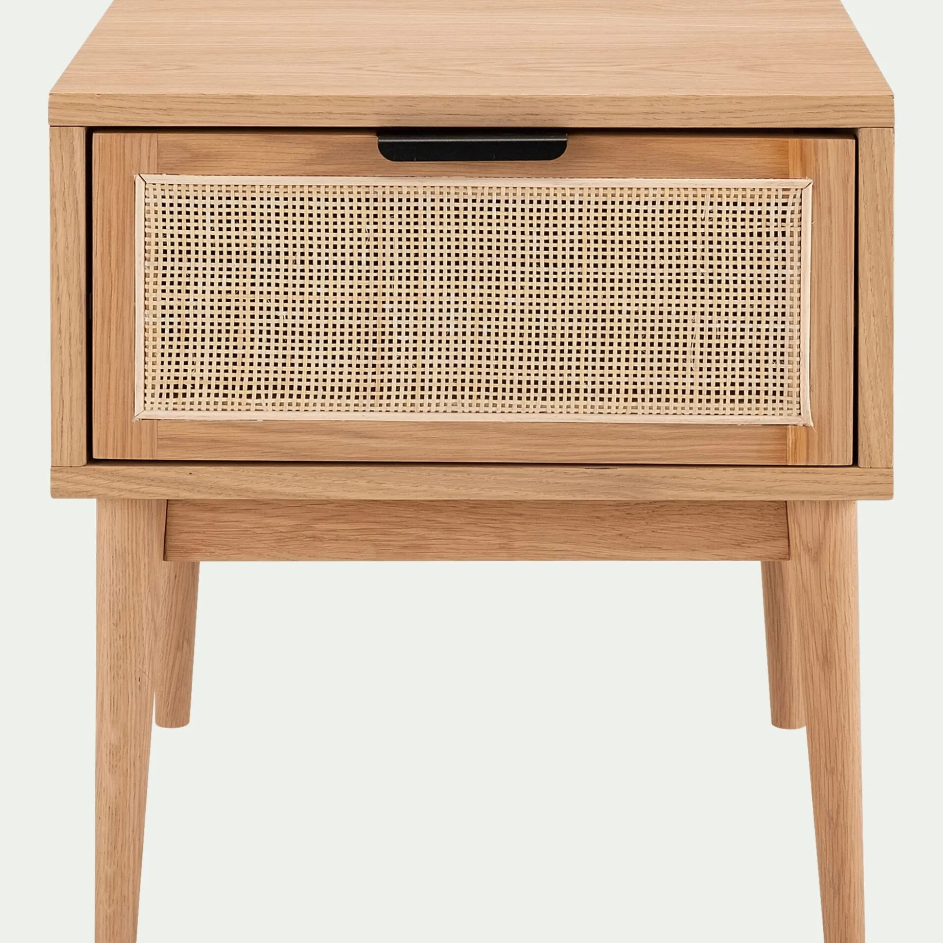 Réchauffez la décoration de la chambre avec cette table de chevet en bois et cannage. La structure en chêne massif arbore un coloris clair, orné de fines veinures. Brut et authentique, ce cadre s’accompagne d’une finition en cannage et d’une poignée noire. Simple mais design, cette table de nuit peut accueillir votre lampe de chevet, un livre, une plante, des cosmétiques… Dans son tiroir coulissant, rangez quelques affaires et profitez d’un intérieur propre et ordonné.