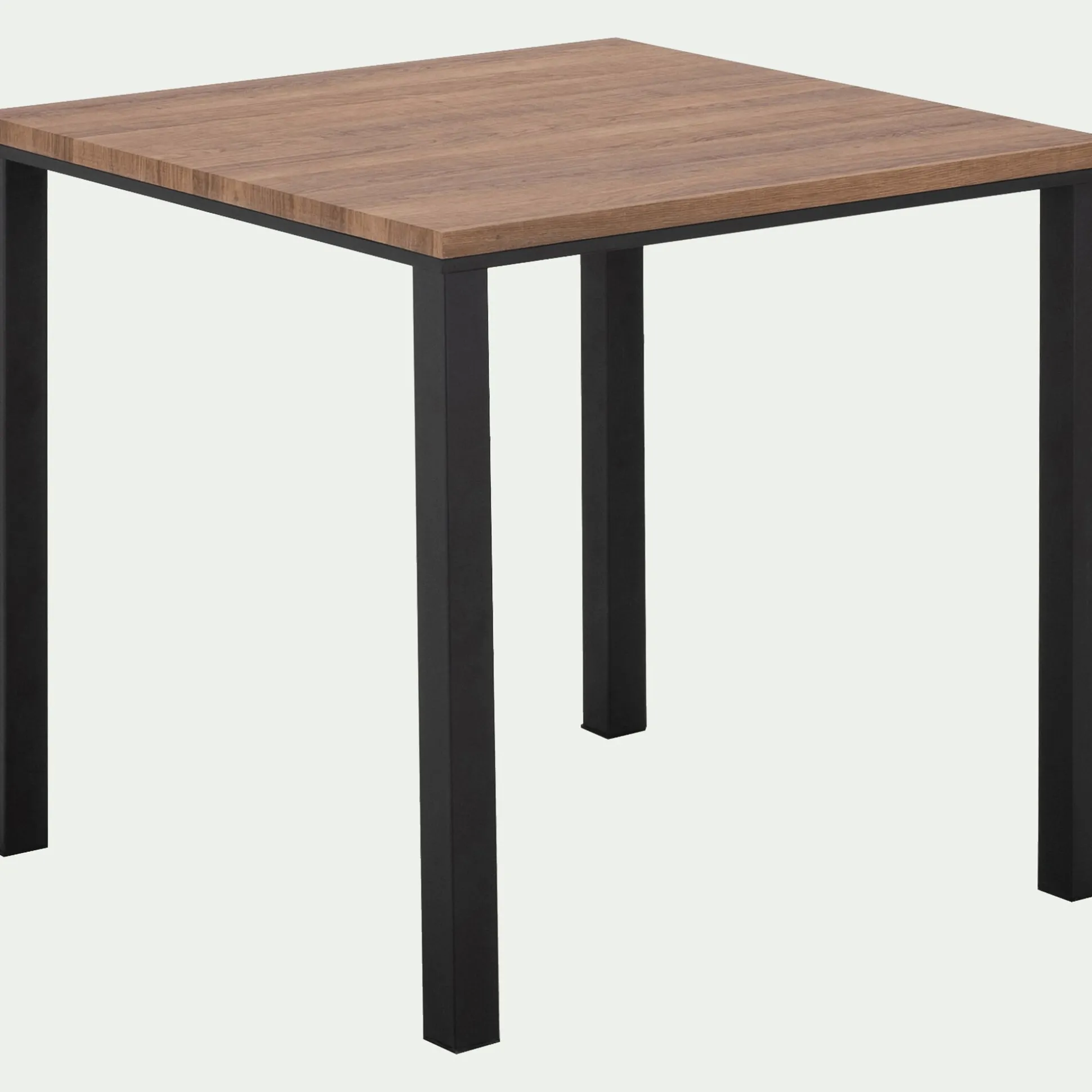 Plateau en panneau de fibres de moyenne densité imitation chêne d’une épaisseur de 2,5cm, avec revêtement papier 3D effet chêne. Struture et piètement en acier epoxy peint noir mat.