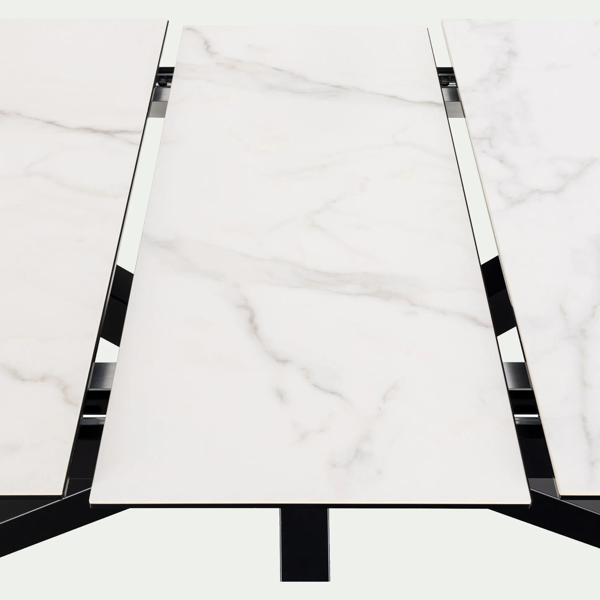 La table de repas 8 places Isota offre un look lumineux et contemporain. Son plateau blanc en céramique et verre trempé contraste élégamment avec le piètement en acier noir. Facile à agrandir grâce à sa rallonge automatique intégrée, elle passe de 168 à 210 cm pour accueillir jusqu’à 8 convives. Cette table extensible conjugue esthétique et durabilité avec brio.