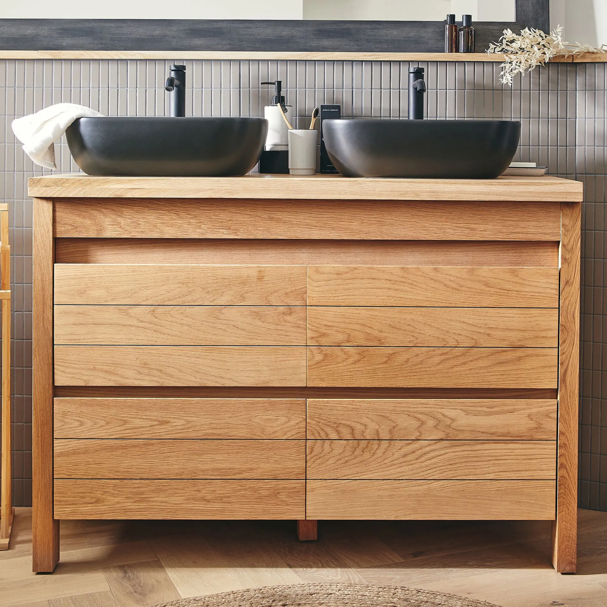 Adoptez ces meubles de salle de bain en chêne pour créer une ambiance reposante et naturelle dans cette pièce.