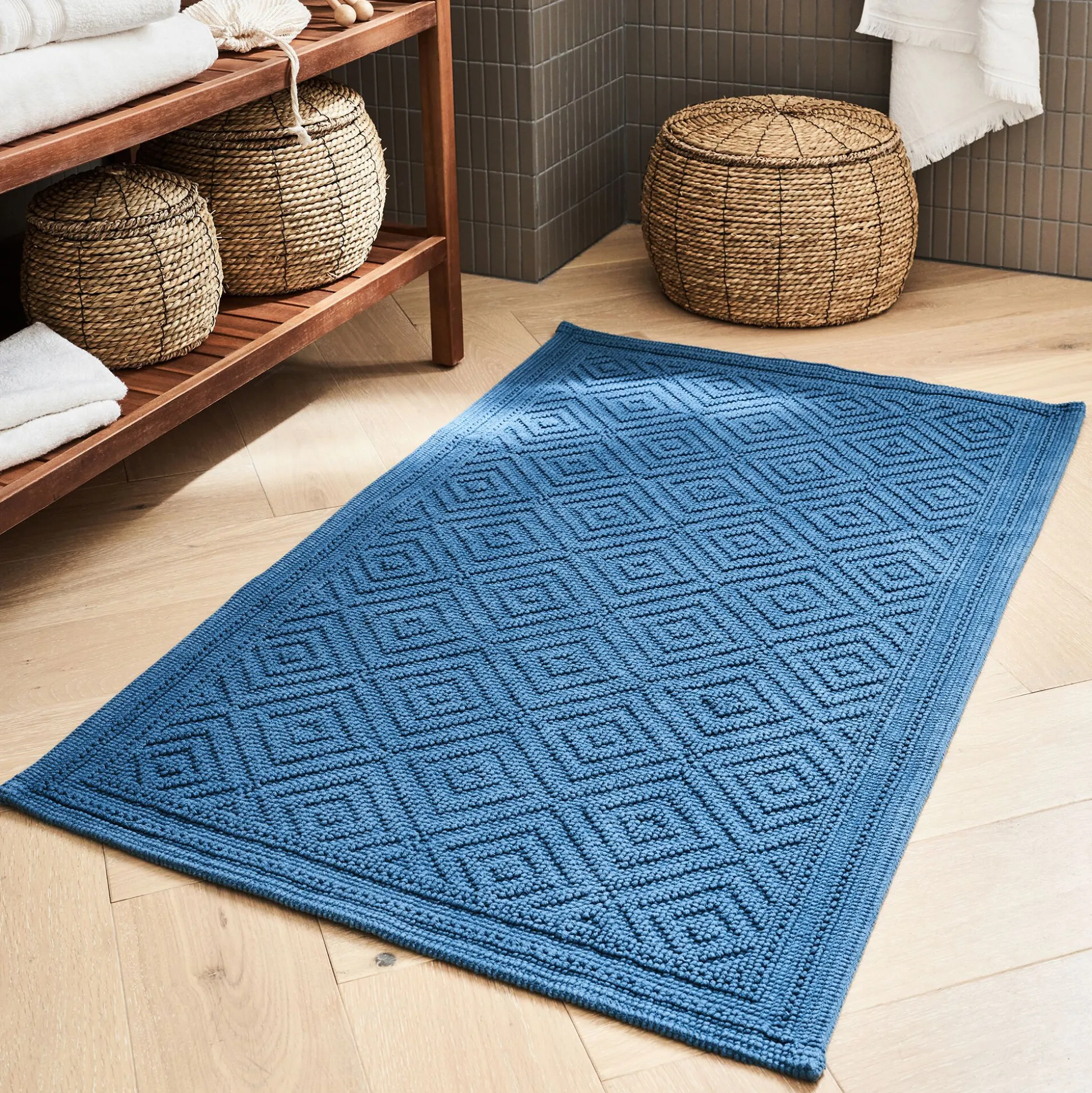 Les pieds sur Terre mais la tête encore ailleur, le matin ne devrait être que douceur. Le tapis de salle de bain bleu figuerolles Sadou offre toute la tendresse nécessaire pour commencer la journée du bon pied. Son tissu épais et fourni procure une sensation agréable, de quoi ne pas se laisser perturber et se réveiller tout en douceur dans la salle de bain. 100% coton, c’est un tapis de très belle qualitéqui fait partie des incontournables. Il a été crée pour durer et supporter tous les passages quotidiens. Disponible en plusieurs coloris, il joue un rôle pratique et décoratif. Sa finition, un piquage en forme de losanges, est très travaillée pour un rendu abouti et qualitatif.