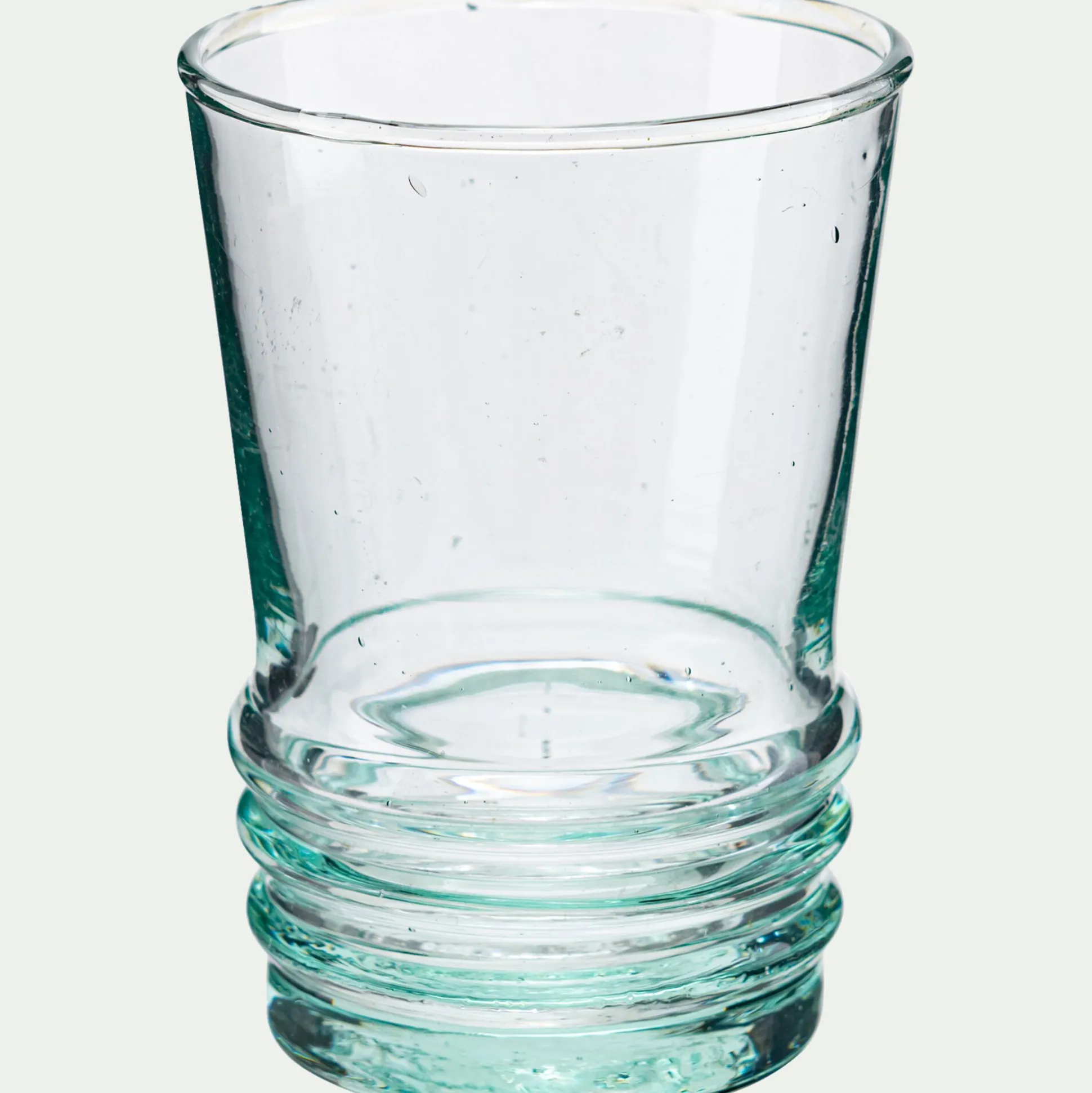 En verre recyclé, les verres Beldi sont soufflés à la bouche et coupés artisanalement à la flamme d’oxygène et de gaz. Les débris repartent à la fusion alors que les verres sont placés dans un four de recuite pendant 3h. Les verres Beldi enchantent par leur design épuré et délicat qui combine les plaisirs et raconte une histoire qui vous transporte sur les bords de la Méditerranée le temps d’un repas.