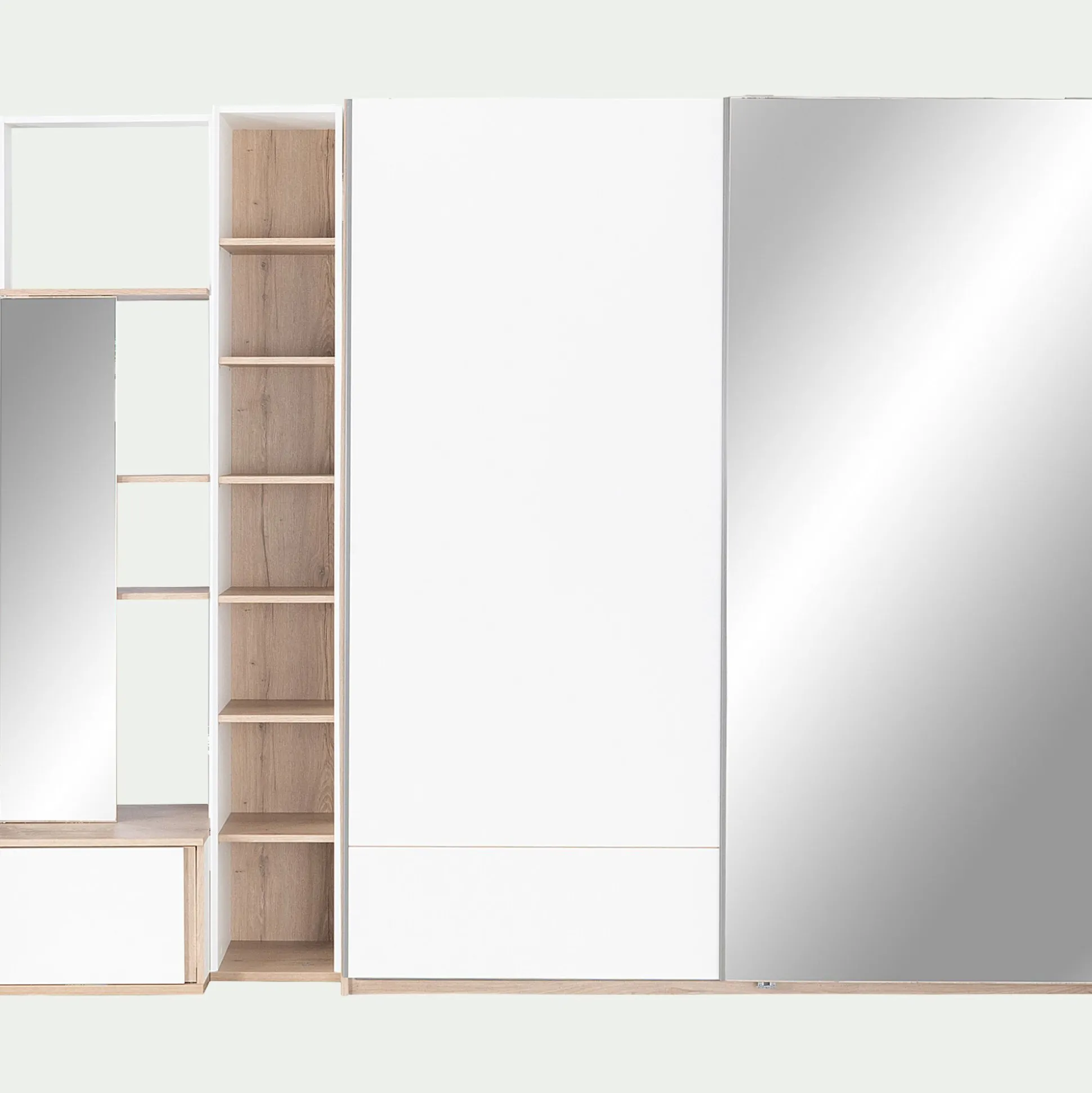 Ici, découvrez un dressing avec deux portes coulissantes, de couleur blanche. Ce meuble vous offre de beaux volumes pour y ranger vos affaires. Vous pouvez choisir cette pièce seule ou associée à un des éléments de la gamme. Chaque module est indépendant, mais ils se complètent aussi parfaitement entre eux. Ce sont des produits de qualité qui vous sont proposés, avec une finition en mélanine et une impression effet bois au toucher. Résistants, ces meubles dureront dans le temps. Le montage de ces derniers est très aisé et se fait en vertical. Les coins des modules sont découpés afin de laisser passer les plinthes et que vous puissiez placer vos meubles contre le mur.