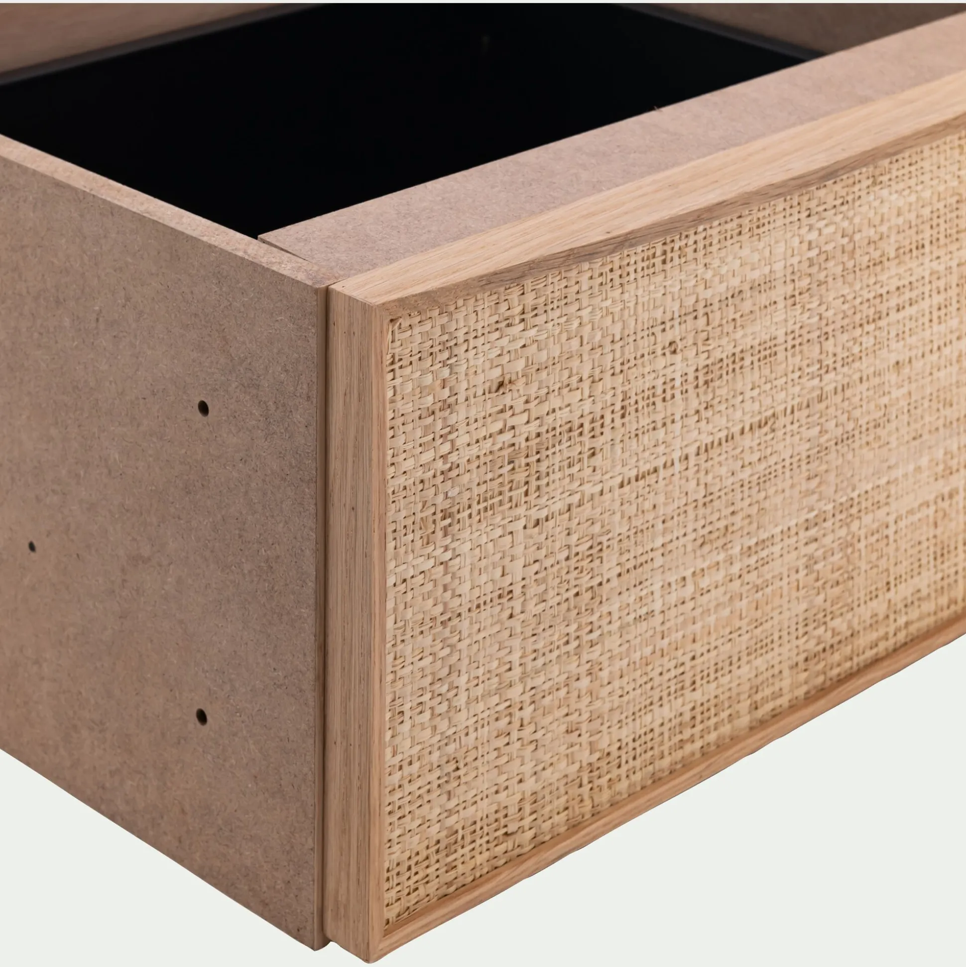 Face du tiroir en chêne massif, placage chêne et raphia.