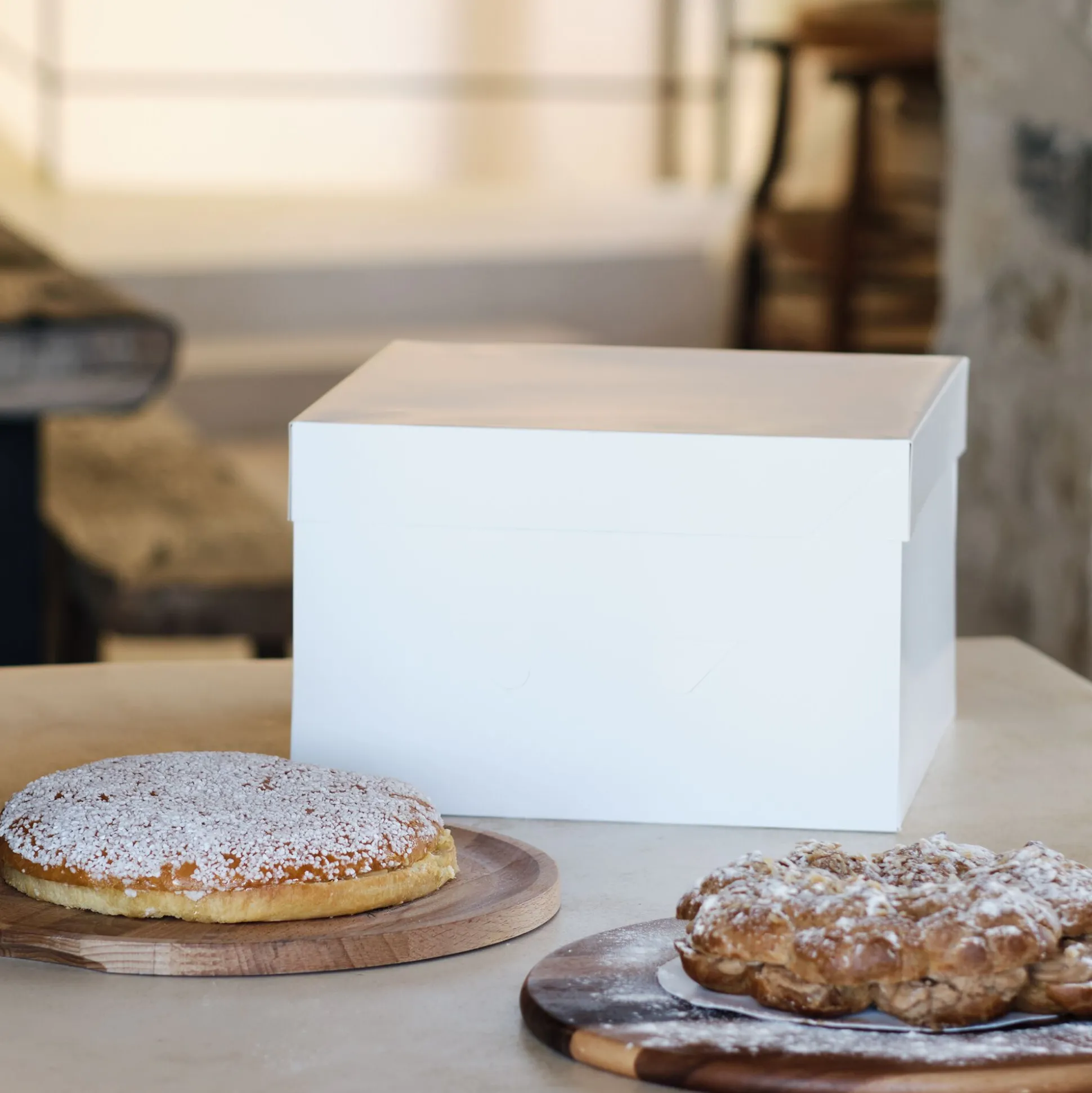 Cette boîte pâtissière de 20 cm de haut est idéale pour transporter et protéger des gâteaux hauts. Son assemblage est rapide et facile, grâce à une conception pratique comprenant un couvercle ajusté. Conforme aux normes de contact alimentaire, elle garantit la sécurité de vos créations. Réutilisable, cette boîte en carton blanc allie durabilité et respect de l’environnement, puisqu’elle peut être recyclée après utilisation. Son design épuré fait de cette boîte un choix parfait pour transporter vos gâteaux avec élégance et sécurité, tout en facilitant le montage et le nettoyage.
