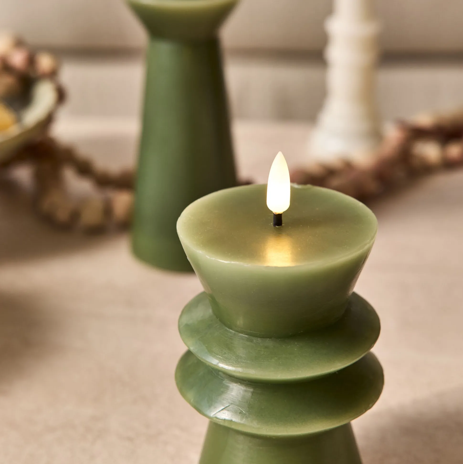 La bougie à LED Naya associe authenticité et praticité. Confectionnée en véritable cire de paraffine, elle affiche une silhouette contemporaine teintée en vert, élégante et moderne. Une petite ampoule en forme de flamme trône au sommet et diffuse une lumière blanc chaud, douce et apaisante. Fonctionnant avec 2 piles AA (non incluses), elle s’allume grâce à un interrupteur discret placé sous la bougie. Pour plus de confort, son minuteur intégré l’éteint automatiquement après 6 heures d’utilisation continue. Un objet déco qui crée une atmosphère chaleureuse sans contrainte.
