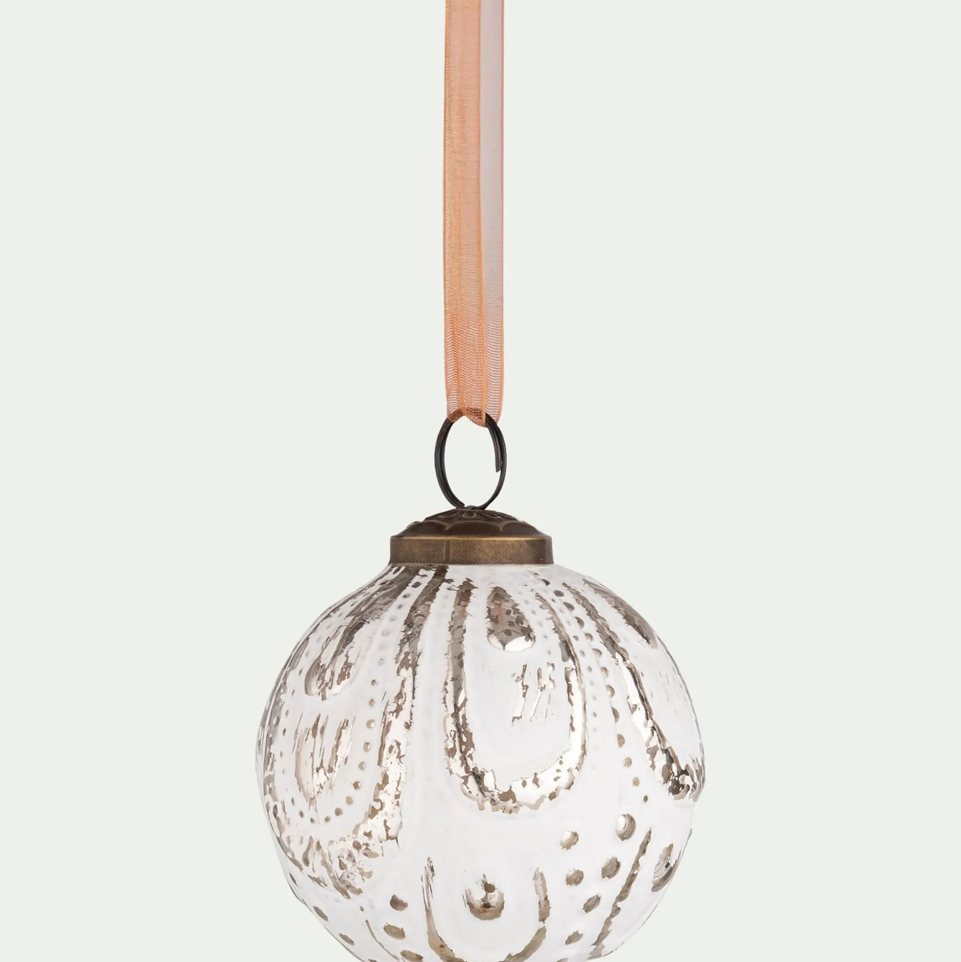 Sublimez votre sapin avec la boule de Noël Sizun. Cette boule ronde est confectionnée en verre. Peinte en blanc, elle arbore un effet patiné pour offrir à la déco un côté vieilli. Ainsi, ses reliefs sont mis en valeur et participent à son originalité. Avec sa fixation en fer doré, cette décoration du sapin se suspend aisément à une branche à l’aide de son ruban.