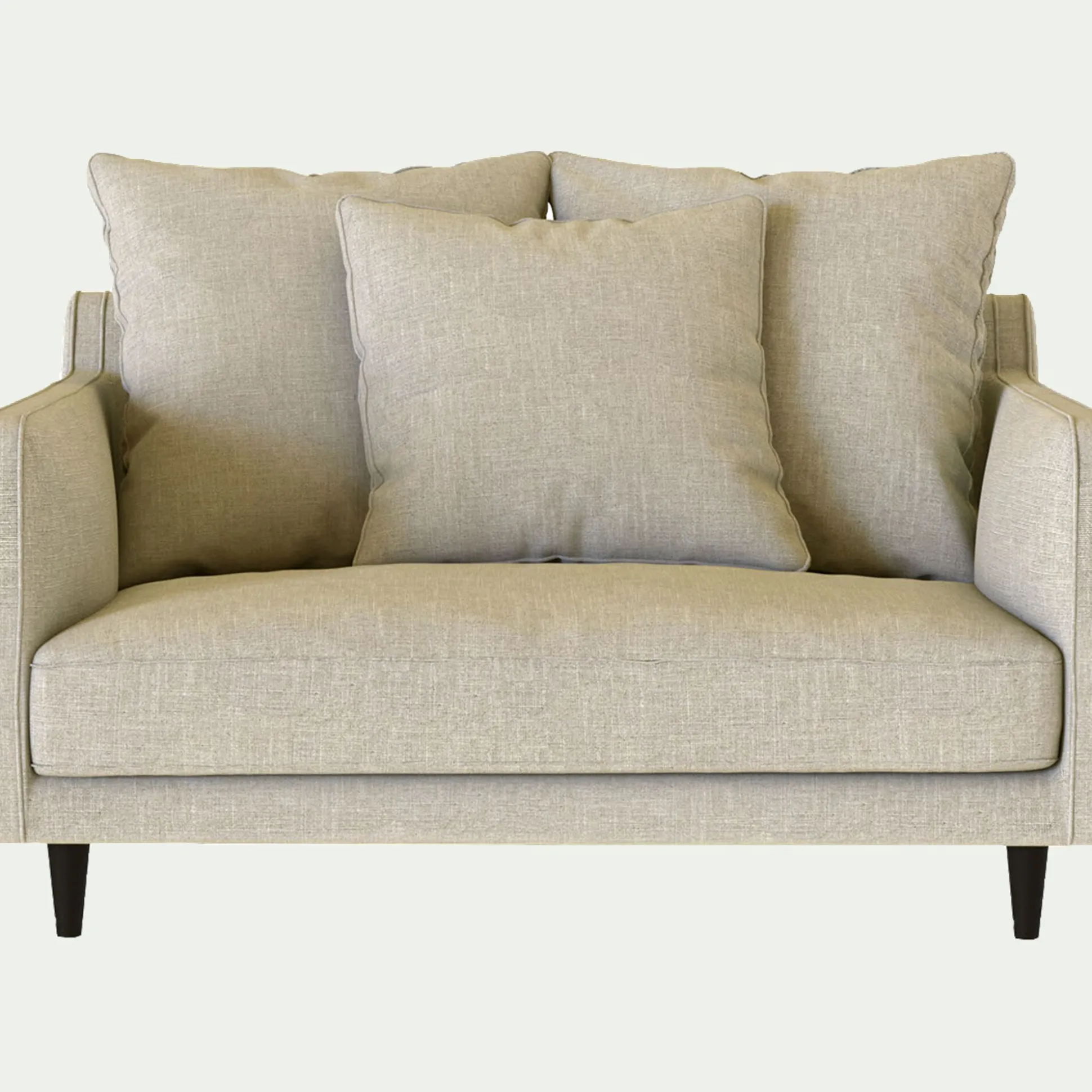 Assise et dossier : Assise en mousse polyuréthane densité 30kg/m3 et couette en fibre polyester. Coussins dossier garnissage plumes d’oies et fibres polyester. 2 coussins de 60x60cm et 1 coussin de 50x50cm.