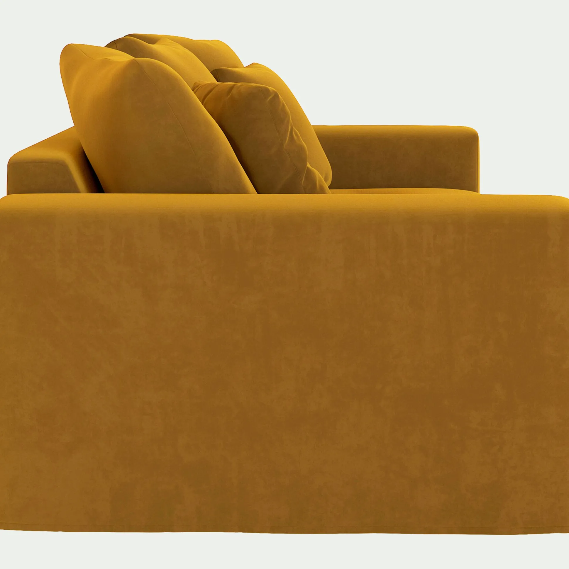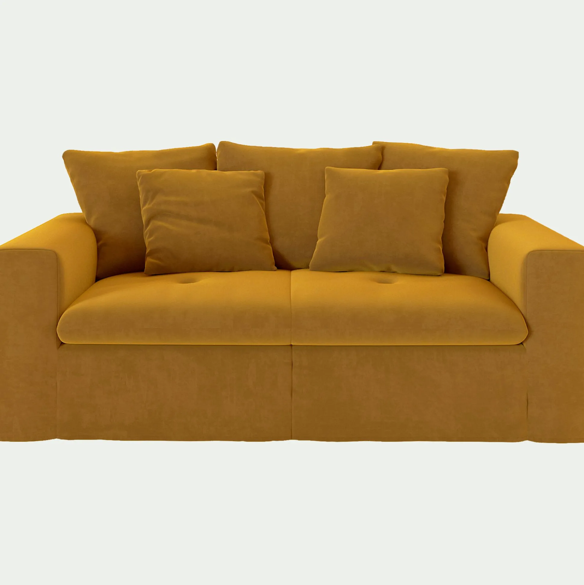 Laissez vous séduire par le charme du canapé Elea, un meuble pensé pour sublimer votre salon. Ce canapé 2 places fixe allie à la fois esthétisme et confort, pour un espace de vie chaleureux. Son dossier à l’accueil plume vous procure une sensation de bien-être douillet alors que sa profonde assise vous donne une impression cocooning d’enveloppement. Ses coussins de dossier, soigneusement jetés, accentuent son aspect accueillant tout en apportant une touche de décoration raffinée. Son surmatelas délicatement intégré confère à l’ensemble une sensation de légèreté fortement appréciable. En ce qui est du design, ses lignes épurées et sa jupe font de lui un atout charme intemporel. Revêtu d’un tissu velours de couleur jaune argan, il vous permet de vous prélasser tout en apportant un côté lumineux et apaisant à votre pièce. Idéal pour la détente ou pour recevoir famille et amis, il incarne à merveille l’équilibre entre sophistication et confort inouï.