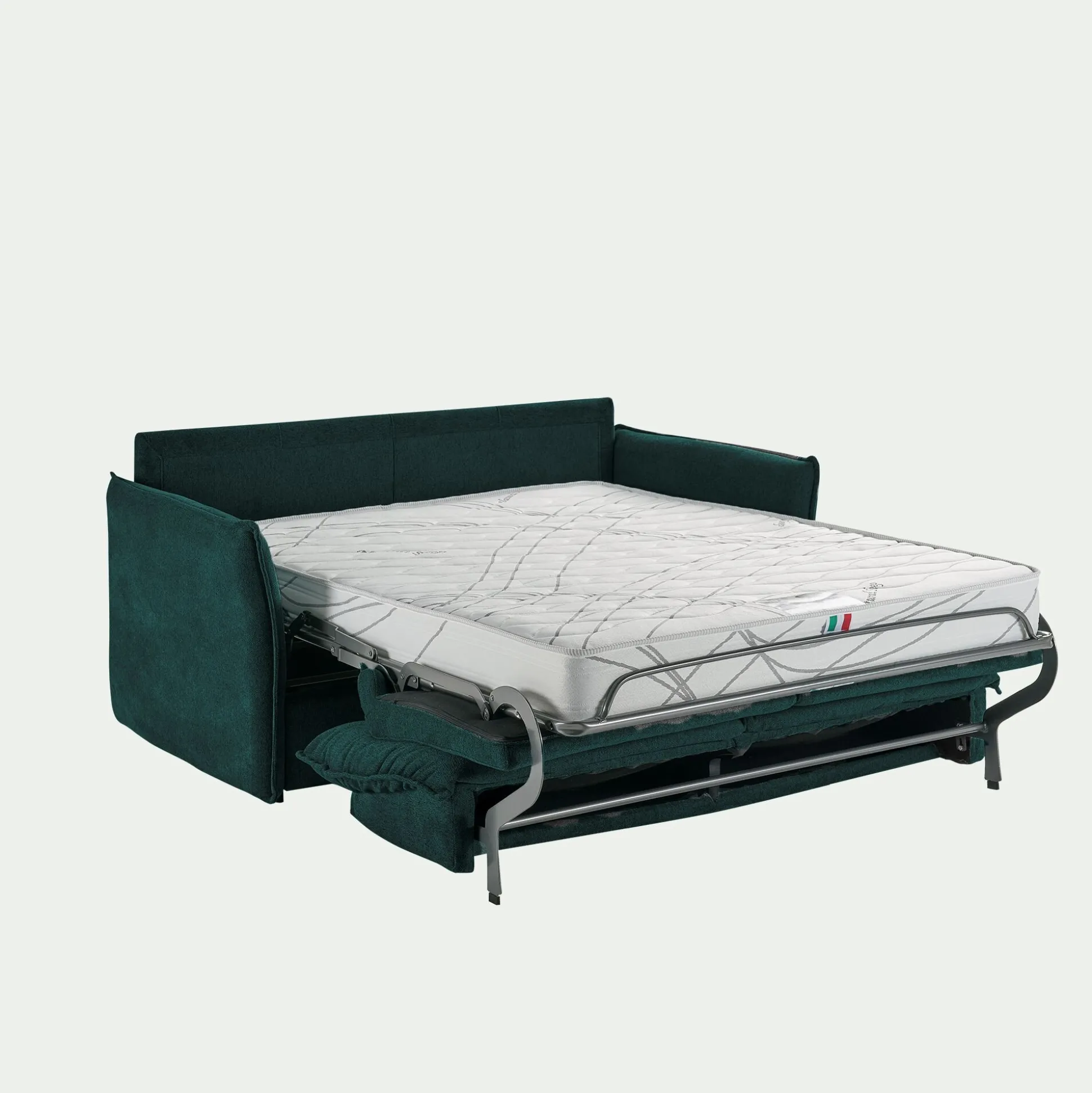 Sommier et matelas : grille métallique électro soudés, sangles élastiques croisées et matelas en mousse polyuréthane densité 35kg/m3, épaisseur 17cm.