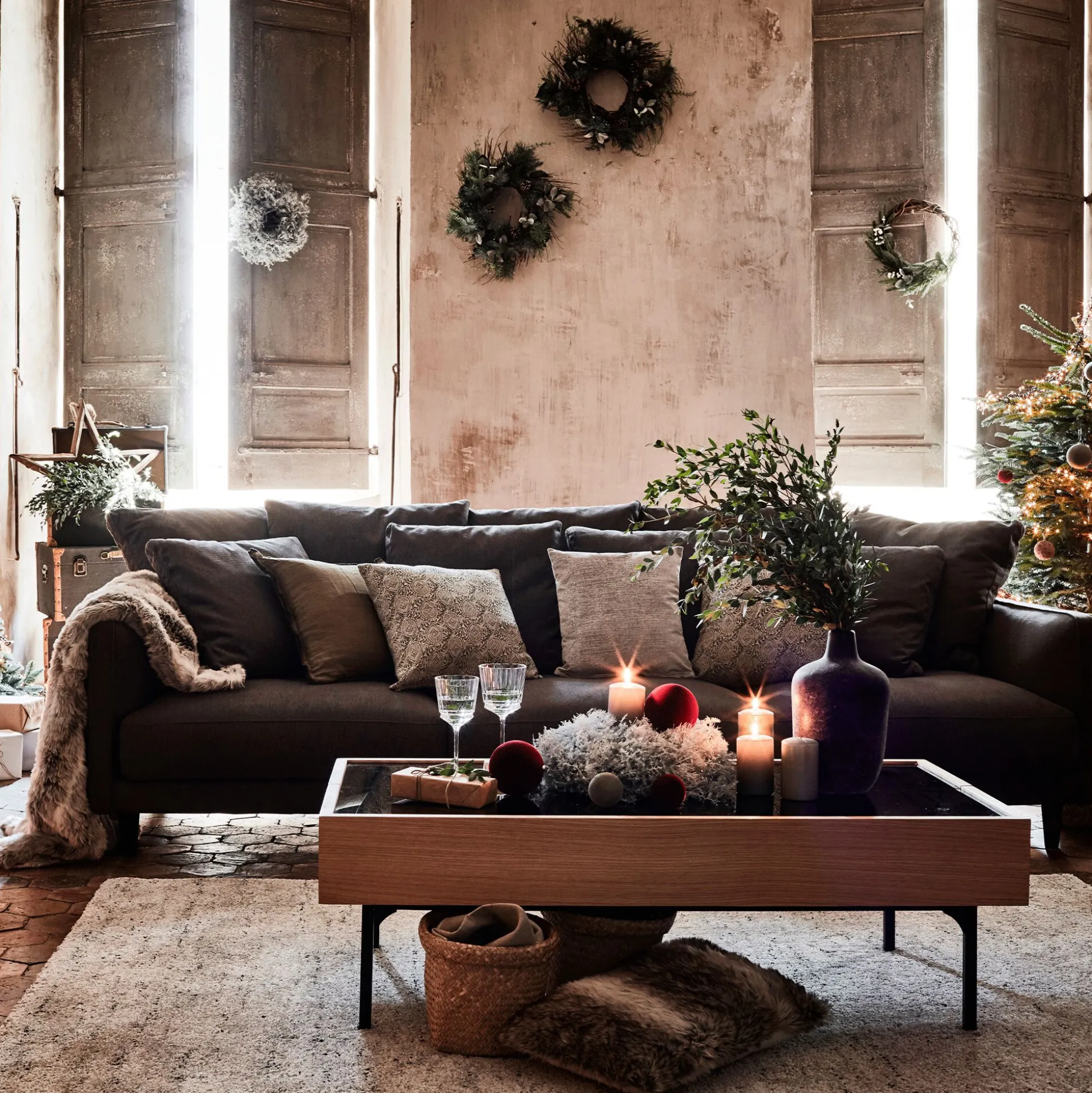 Assise et dossier : Garnissage assise en mousse polyuréthane densité 30kg/m3 et couette en fibre polyester. 3 coussins 60x60cm et 2 coussins 50x50cm garnissage plumes d’oie et fibres polyester.