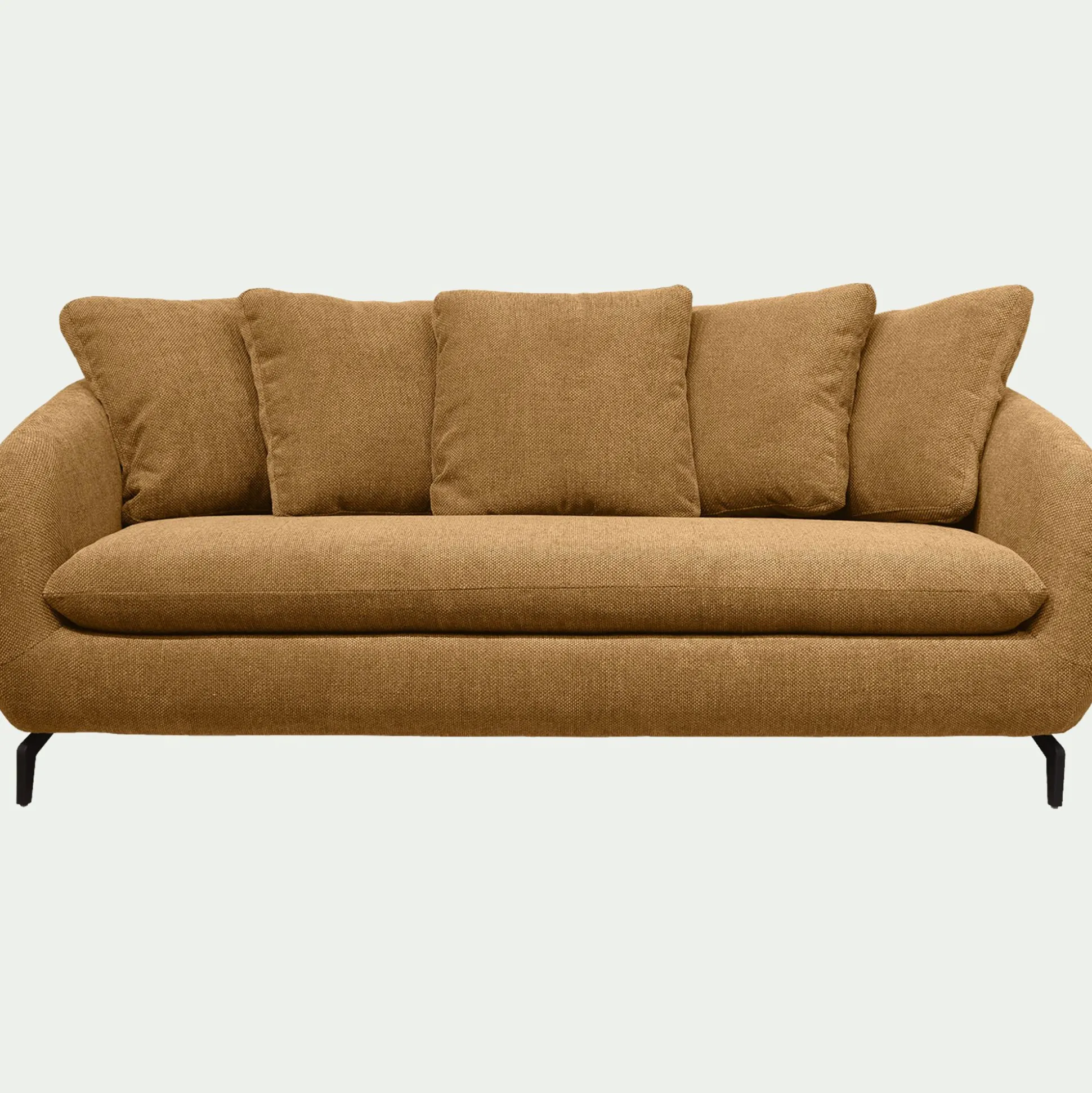 Un joli canapé 3 places fixe en tissu pour profiter agréablement de votre salon. Un look contemporain et accueillant, sublimé par un piétement original en acier noir. Vous apprécierez la forme du dossier et des accoudoirs qui vous offrent un maintien optimal de votre dos pour un confort d’assise exceptionnel. Un canapé fabriqué en France, dans des ateliers proches de la ville de Bourge, qui incarne l’excellence du savoir-faire français. Un coloris bronze qui apporte une note lumineuse et chaleureuse à votre décoration de salon.