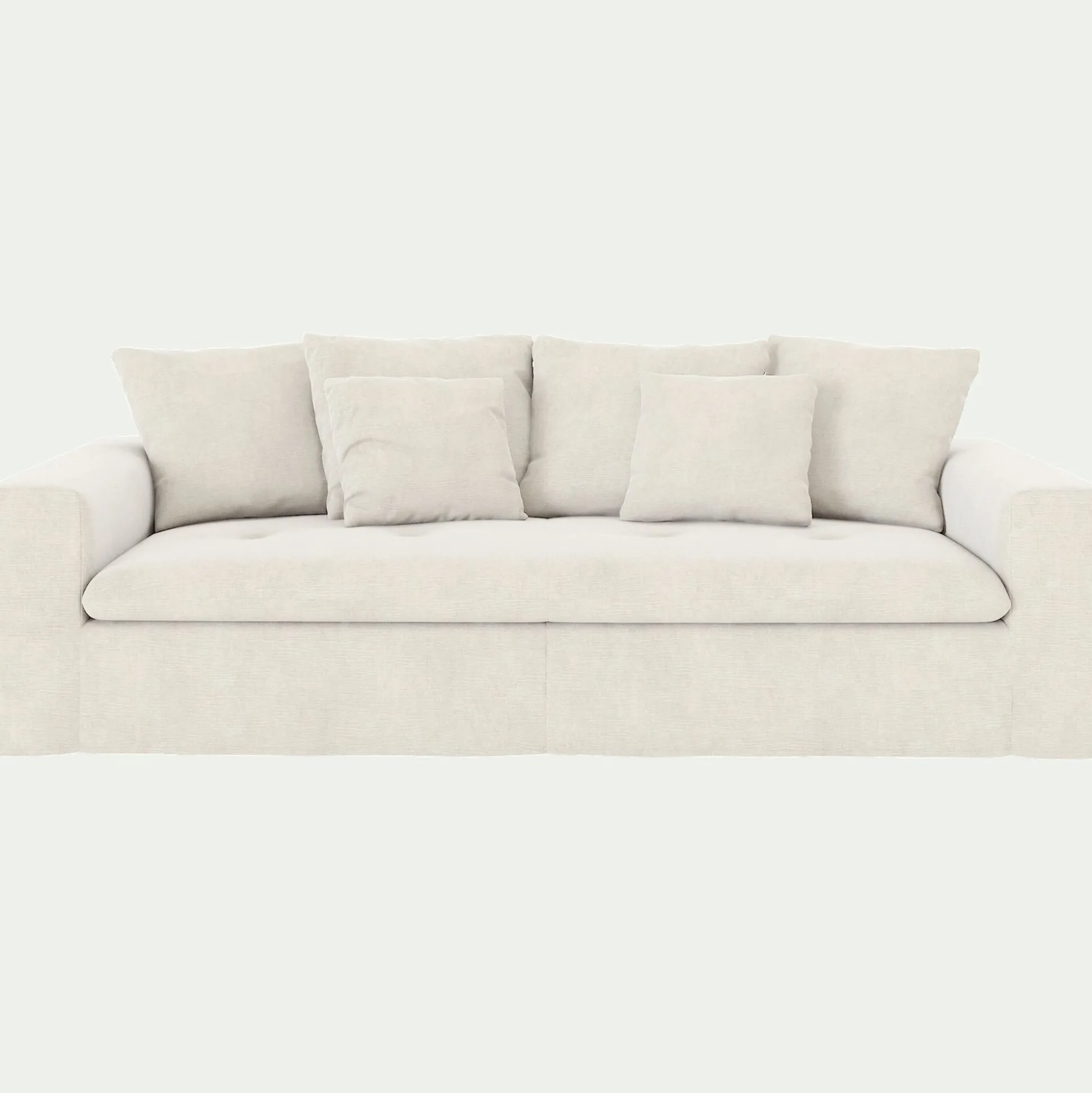 Laissez vous séduire par le charme du canapé Elea, un meuble pensé pour sublimer votre salon. Ce canapé 4 places fixe allie à la fois esthétisme et confort, pour un espace de vie chaleureux. Son dossier à l’accueil plume vous procure une sensation de bien-être douillet alors que sa profonde assise vous donne une impression cocooning d’enveloppement. Ses coussins de dossier, soigneusement jetés, accentuent son aspect accueillant tout en apportant une touche de décoration raffinée. Son surmatelas délicatement intégré confère à l’ensemble une sensation de légèreté fortement appréciable. En ce qui est du design, ses lignes épurées et sa jupe font de lui un atout charme intemporel. Revêtu d’un tissu doux de couleur blanc ventoux, il vous permet de vous prélasser tout en apportant un côté lumineux et apaisant à votre pièce. Idéal pour la détente ou pour recevoir famille et amis, il incarne à merveille l’équilibre entre sophistication et confort inouï.