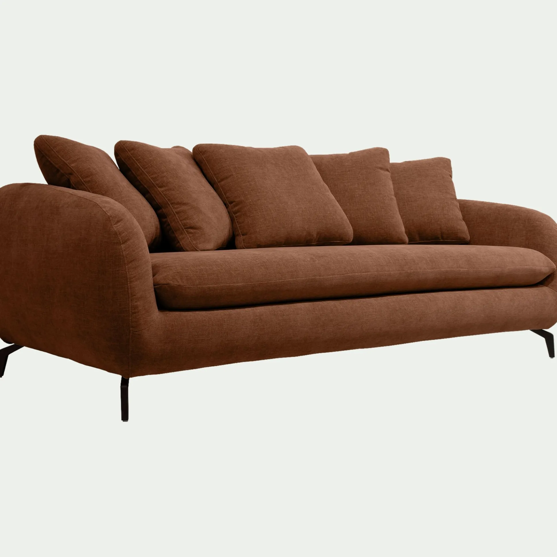 Un joli canapé fixe en tissu pour profiter agréablement de votre salon. Un look contemporain et accueillant, sublimé par un piétement original en acier noir. Vous apprécierez la forme du dossier et des accoudoirs qui vous offrent un maintien optimal de votre dos pour un confort d’assise exceptionnel. Un canapé fabriqué en France, dans des ateliers proches de la ville de Bourge, qui incarne l’excellence du savoir-faire français. Un coloris brun rustrel qui apporte une note lumineuse et chaleureuse à votre décoration de salon.